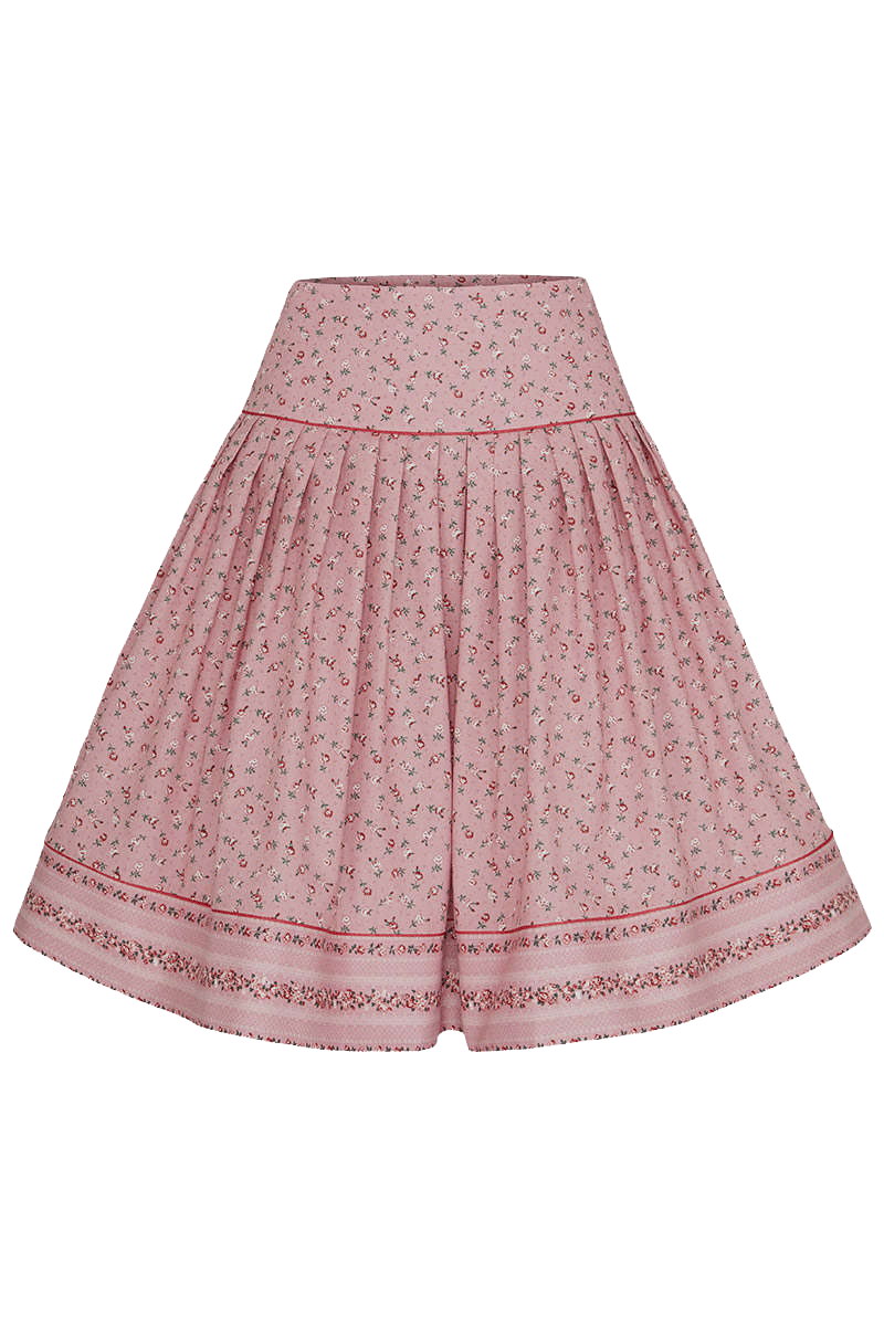 Den Trachtenrock von Berwin & Wolff schmückt ein kleinteiliges aufgedrucktes Blütenmuster. Der 12 cm breite Bund und der Saum sind mit einer schmalen Paspelierung in dunklem Rosa vom Hauptteil des Rockes abgesetzt. Der Rock wird mit einem Reißverschluss seitlich links geschlossen. In Größe 34 ist der Rock 62 cm lang.