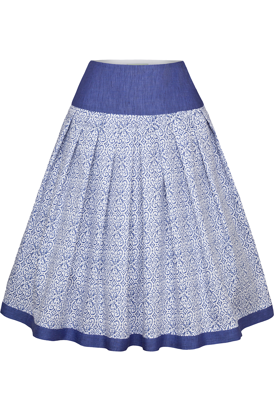 Der Oberstoff aus reiner Baumwolle ist angenehm leicht und atmungsaktiv, was ihn besonders an warmen Tagen zu einem komfortablen Begleiter macht. Das florale Muster verleiht dem Rock eine feminine Note, während der ca. 12 cm breite, unifarbene Bund einen stilvollen Kontrast setzt.