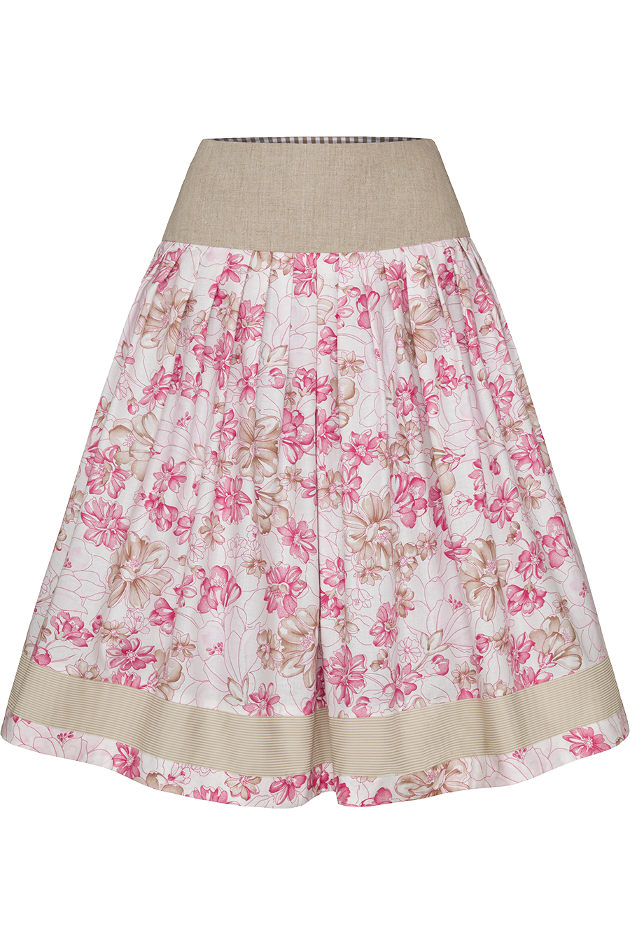 Der ca. 12 cm breite Bund aus einem hochwertigen Leinen-Baumwoll-Mix bildet einen stilvollen Kontrast zum gemusterten Rockteil. Ein weiterer Blickfang ist der gestreifte Kontraststoff am Rocksaum, der das Gesamtbild harmonisch abrundet.