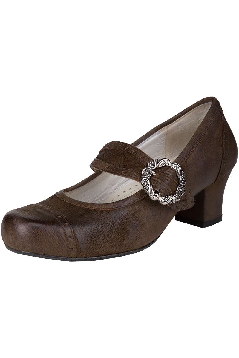 Dieser hochwertige und schlichte Pumps passt perfekt zu jedem Dirndl. Der Pumps ist mit einem Riemen ausgestattet der durch eine aufwendig verzierte Metallschnalle verstellbar ist. Der Pumps ist dezent verziert und in Glattleder gehalten. Der Absatz des Pumps ist ca. 4,5 cm hoch.