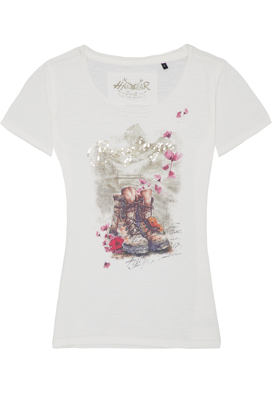 Auf der Vorderseite sind Berge, Wanderstiefel und Blüten aufgedruckt – ergänzt durch den funkelnden Schriftzug 'Bergtage', der mit Pailletten bestickt ist und dem Shirt eine verspielte Note verleiht.
