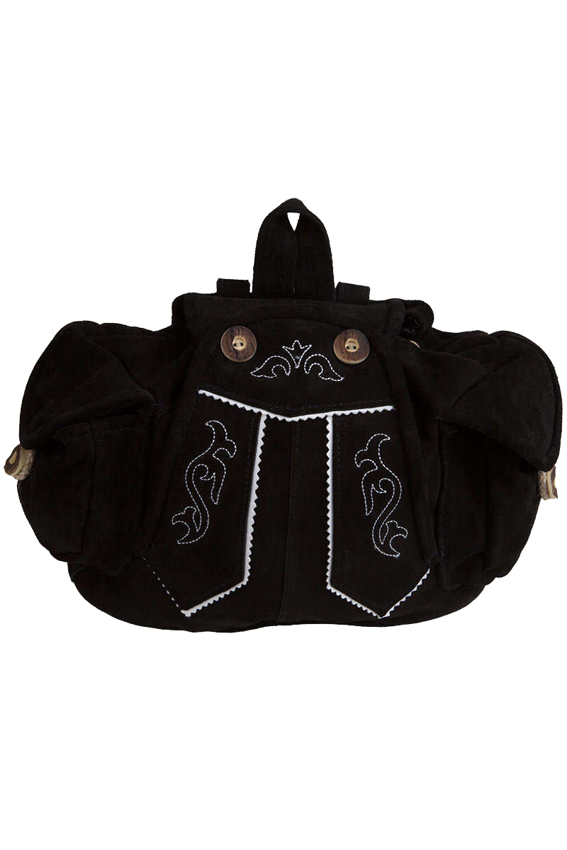 Dieser süße und aufwendig gestaltete, schwarze Lederrucksack in Form einer kleinen Lederhose ist der absolute Hingucker. Der Latz der Lederhose ist mittig auf dem Rucksack platziert. Rechts und links davon befinden sich zwei kleine Taschen die mit Knöpfen in Hirschhornoptik und einem derben Seil geschlossen werden. Oben am Latz ist der Zugang zum Hauptfach des Rucksacks angebracht. Dieser wird ebenfalls mit zwei Knöpfen in Hirschhornoptik geschlossen. Oben an der Rucksacköffnung befindet sich ebenfalls ein derbes Seil mit dem der Rucksack zugeschnürt werden kann. Das Futter des Rucksacks ist aus schwarzem Stoff. Die Rucksack Träger sind mittels zwei Metallschnallen höhenverstellbar.Länge: 30 cmBreite: 11 cmHöhe: 24 cm