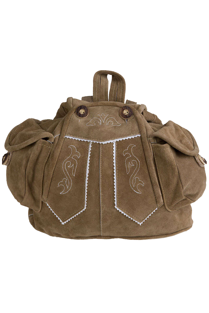 Dieser süße und aufwendig gestaltete, naturfarbene Lederrucksack in Form einer kleinen Lederhose ist der absolute Hingucker. Der Latz der Lederhose ist mittig auf dem Rucksack platziert. Rechts und links davon befinden sich zwei kleine Taschen die mit Knöpfen in Hirschhornoptik und einem derben Seil geschlossen werden. Oben am Latz ist der Zugang zum Hauptfach des Rucksacks angebracht. Dieser wird ebenfalls mit zwei Knöpfen in Hirschhornoptik geschlossen. Oben an der Rucksacköffnung befindet sich ebenfalls ein derbes Seil mit dem der Rucksack zugeschnürt werden kann. Das Futter des Rucksacks ist aus Stoff. Die Rucksack Träger sind mittels zwei Metallschnallen höhenverstellbar.Länge: 30 cmBreite: 11 cmHöhe: 24 cm
