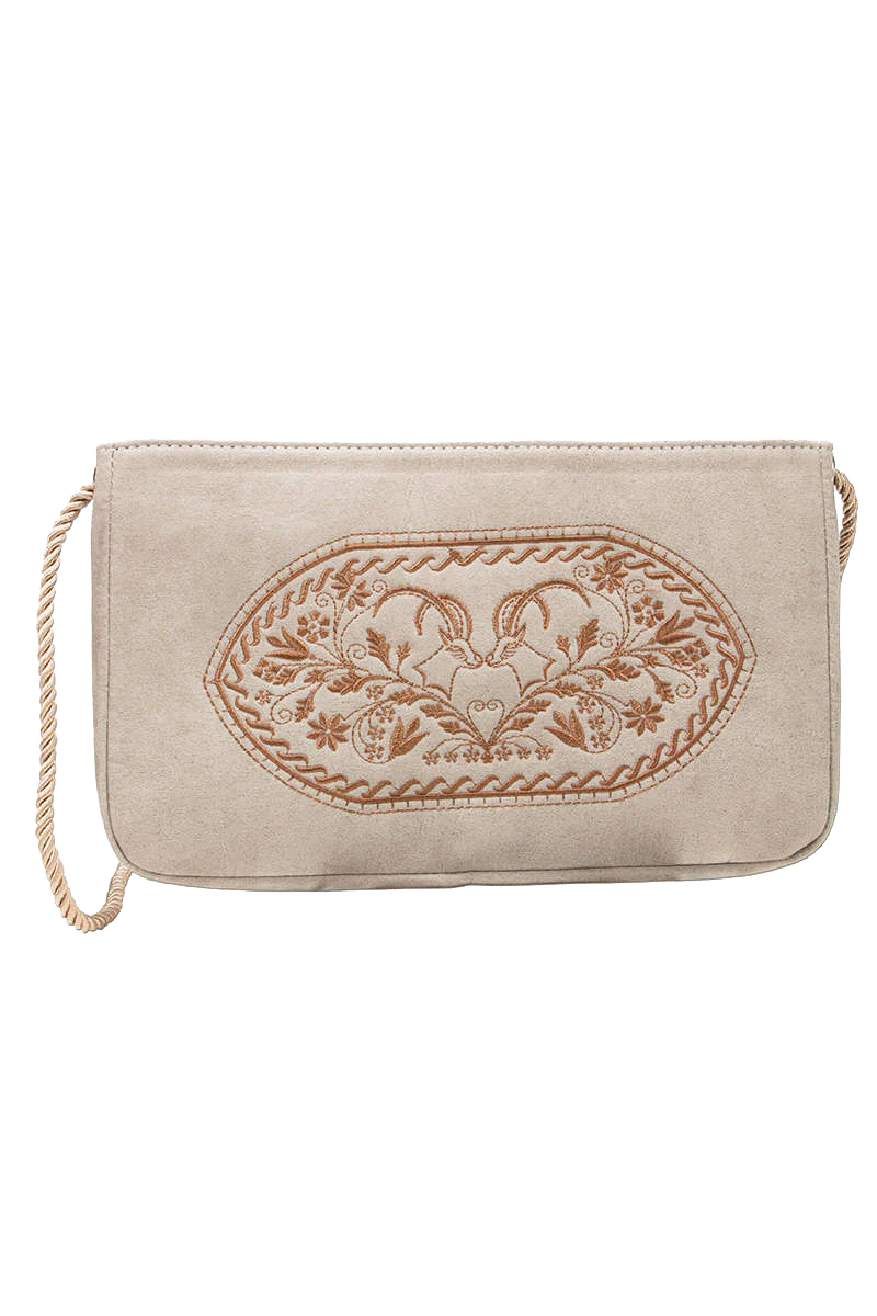Liebevolle Trachtentasche von Alpenflüstern mit dekorativer Steinbock Stickerei. Sie bietet für die wichtigsten Dinge rund ums Dirndl Platz genug. Die Clutch kann mit einem Reißverschluss geschlossen werden. Ausgestattet ist die Tasche mit einem Innenfutter und einem Schulterband aus Satinkordel das selbstständig in der Länge gekürzt werden kann.