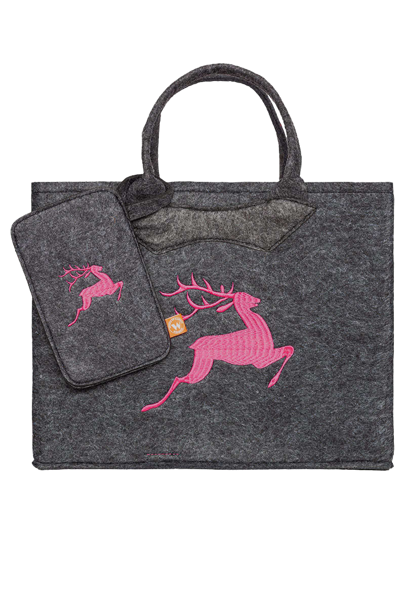 Bei dieser schönen Trachtentasche aus dem Hause Witzgall trifft Tradition auf Moderne. Sie ist nicht nur schön, sondern auch praktisch mit dem dazu passenden Handy-Etui. Die rechteckige Tasche ist aus anthrazit farbenem Filz. Das Highlight ist der gestickte pinke Hirsch auf der Vorderseite.Diese schöne alltagstaugliche Trachtentasche vervollständigt ihr Trachtenoutfit.Tasche: 38x20x30 cm Handytasche H 16x7 cmGriffhöhe: ca. 15 cm