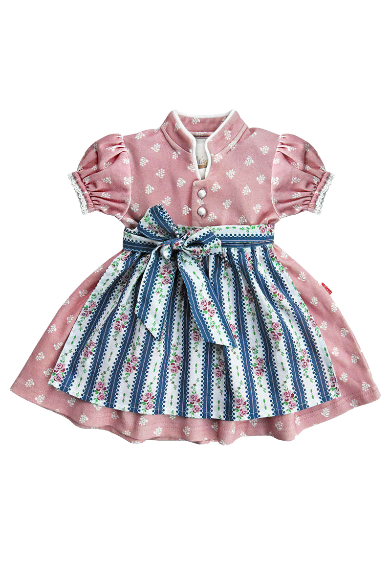 Mit der „Wilden Kaiserin" von Mogo können auch schon Babys zünftig in Tracht gekleidet werden. Das rosa Kleid mit Blumenaufdruck ist aus anschmiegsamem Baumwolljersey gefertigt. Geknöpft wird es mit perlenförmigen Knöpfen. Die kurzen Ärmel sind mit Gummizug und weißer Spitze abgeschlossen. Wie bei einem echtes Dirndl für die großen Madl gehört auch hier eine fesche Schürze mit Streifenmuster dazu.
