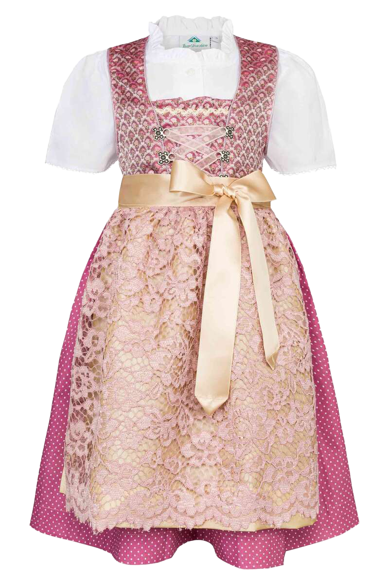Sieht Ihre Tochter im Dirndl auch schon aus wie eine richtig fesche Maid?In diesem wunderschön romantischen rosa, lila und cremefarbenen Dirndl der Marke Isar-Trachten ganz bestimmt. Neben der märchenhaften Schürze aus durchscheinender Spitze sorgt auch das wunderschön gemusterte, auberginefarbene Oberteil des Dirndls dafür, dass Ihr kleiner Schatz wie eine Prinzessin aussieht, wenn sie dieses Dirndl trägt, und auch das edel wirkende Bindeband auf der Brust lässt Ihren Schatz schon richtig erwachsen und elegant wirken.Damit die Schürze nicht hinunterfällt, hat sie ein Knopfloch und kann vorne auf dem Bauch unter der Schleife am Dirndl befestigt werden. So kann sie Ihrem Schatz nicht verloren gehen. Das Dirndl hat einen langen, verdeckten Reißverschluss auf dem Rücken, so dass es sehr praktisch an- und auszuziehen ist.Wer ein wildromantisch-elegantes Dirndl für seinen Lieblingsschatz - der unbedingt schon zu den Großen gehören will - sucht, ist hier also genau richtig.Die Rocklänge in Größe 110 beträgt 37 cm.