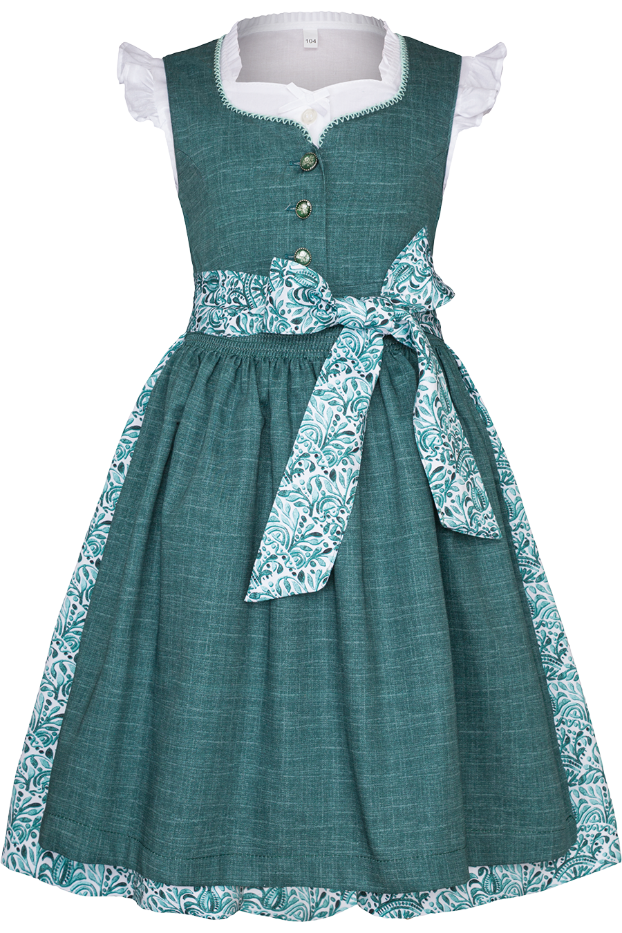 Die dazugehörige lange Bluse begeistert mit niedlichen Flügelärmelchen, einem eckigen Ausschnitt mit dekorativer Schleife und Rüschchenverarbeitung und einer durchgehenden Knopfleiste. Perfekt für alle Trachtenprinzessinnen.