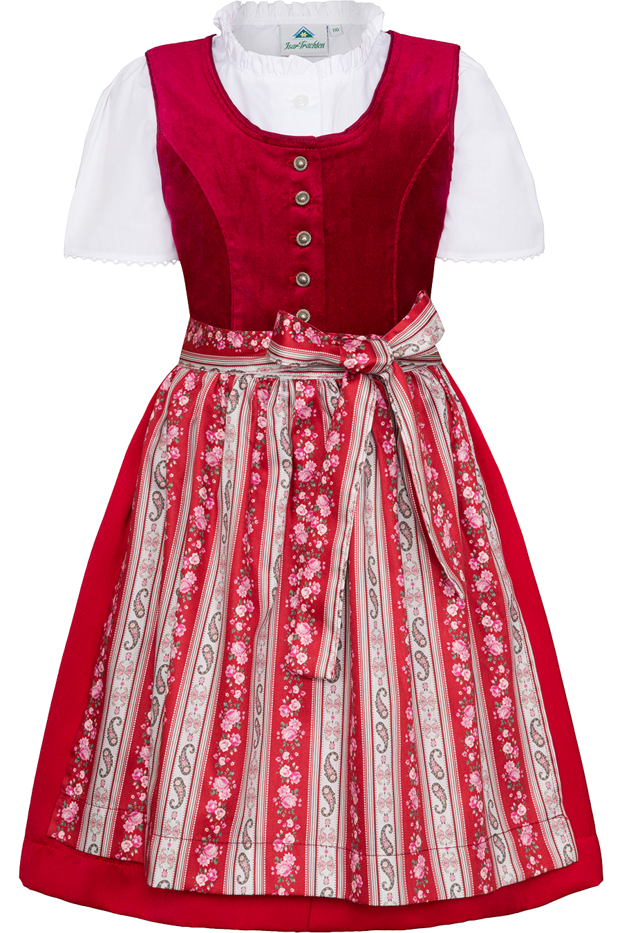 Der einfarbige, glänzende Rockteil bringt klassischen Trachtencharme ins Spiel, während die gemusterte Schürze mit Blumenranken und Paisley-Streifen für einen verspielten, zugleich traditionellen Akzent sorgt. Die farblich abgestimmten Schürzenbänder unterstreichen das stimmige Gesamtbild.