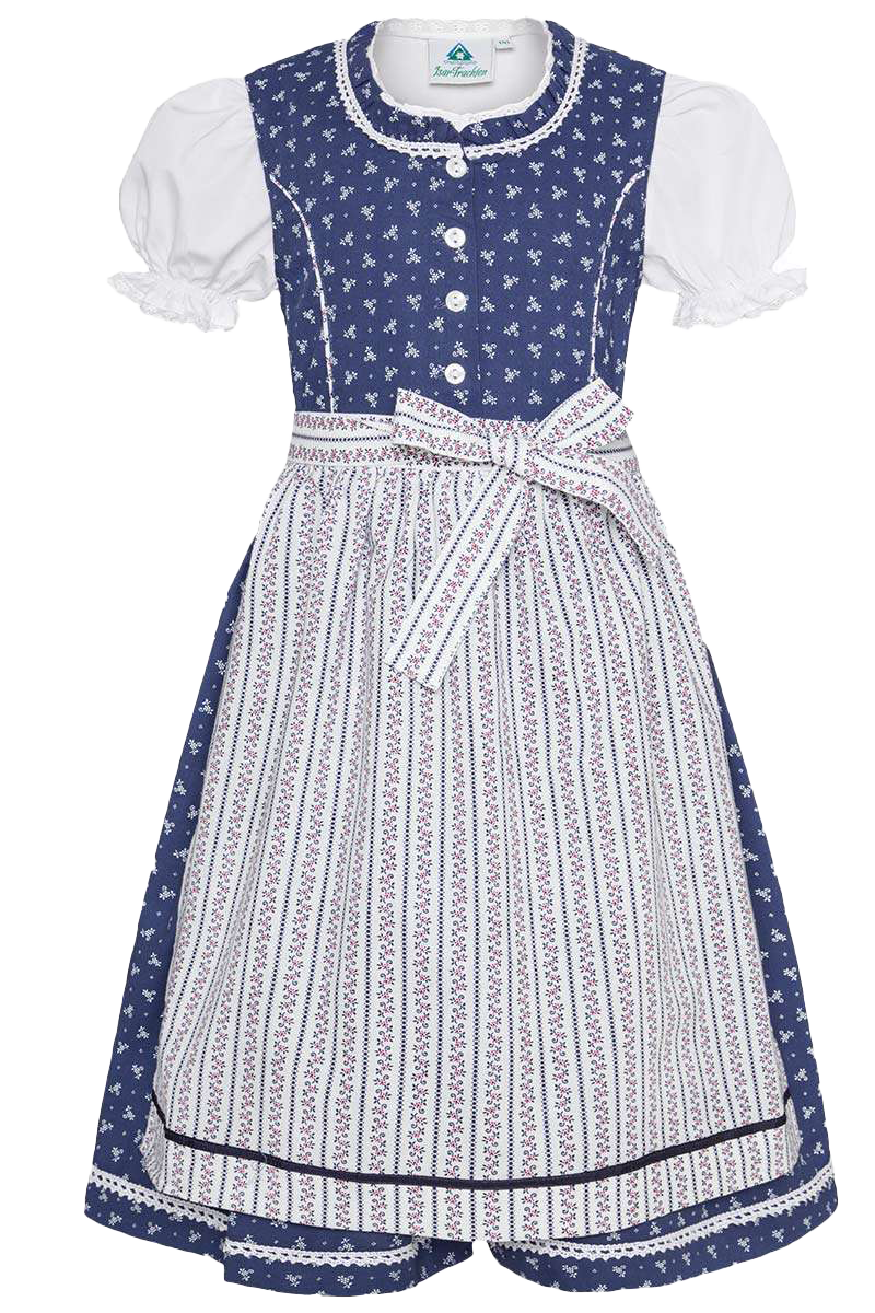 Für unsere kleinen Trachten-Prinzessinnen ist dieses blaue Dirndl und die weiße Bluse mit Puffärmel genau das richtige um sich richtig schick zu fühlen.Das Dirndlkleid ist durchgängig mit Knöpfen in Perlmuttoptik geschlossen und hat am Ausschnitt einen Saum und zwei Wiener Nähte aus demselben Streublumenstoff wie die Schürze. Die Bluse ist mit Spitzen am Ausschnitt und den Ärmeln besetzt, die mit Gummizügen gerafft sind. Sowohl Kleid und Schürze aus 100 % Baumwolle als auch die Bluse aus Mischgewebe (67 % Polyester, 33 % Baumwolle) sind sehr pflegeleicht und angenehm zu Tragen.