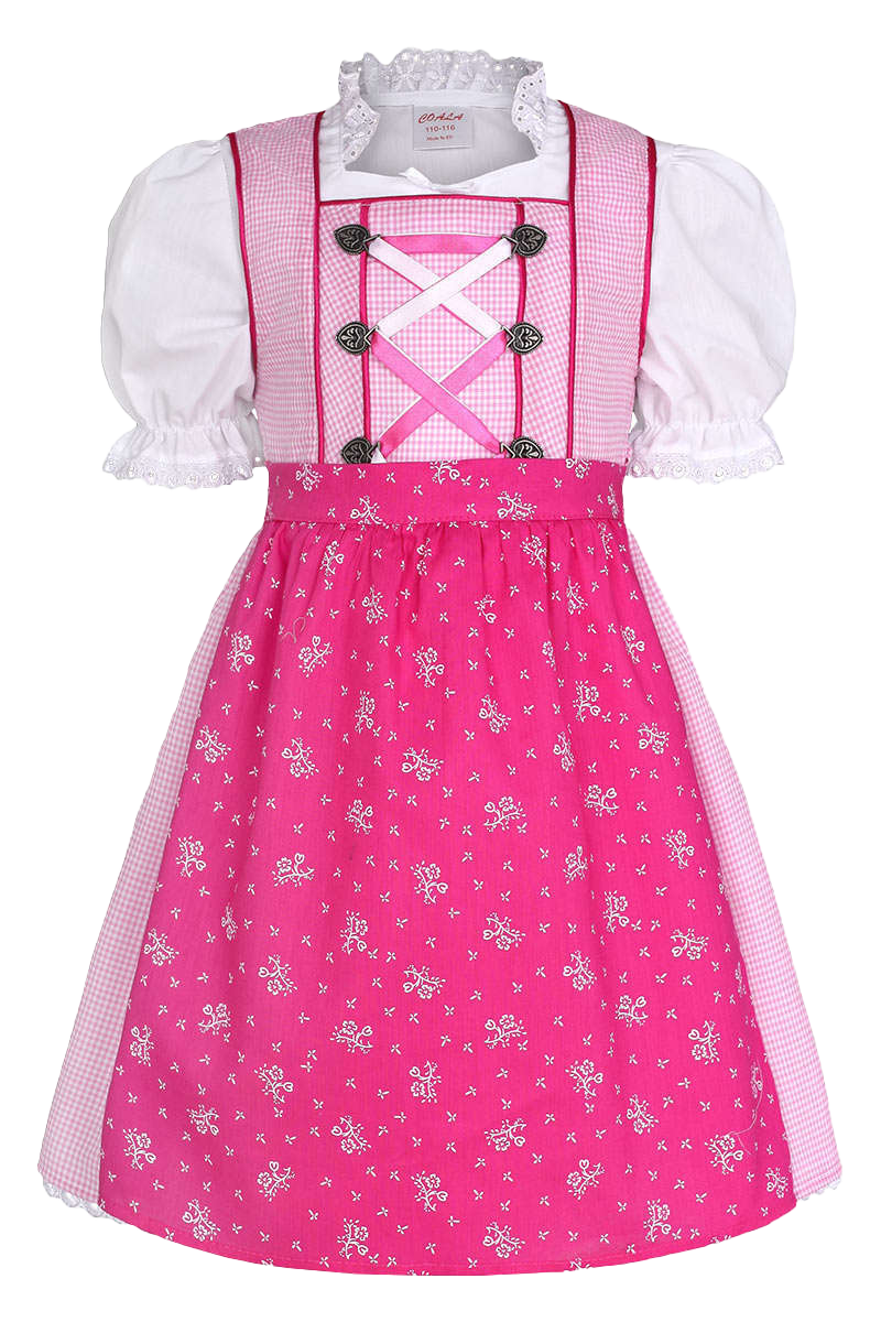 Dieses fesche und freche Dirndl ist für jeden kleinen Trachtenfan die richtige Wahl. Der tolle Kontrast von dem schlichten Rosa und dem kräftigen Pink verleiht dem Dirndl seine jugendliche und frische Note. Das Oberteil und der Rock des Dirndls sind mit kleinen Karos in Pink und Weiß geschmückt. Die Ärmelabschlüsse und Zierstreifen am Oberteil sind aus schillerndem,pinkfarbenem Stoff gearbeitet. Die Zierschnürung ist aus pinken und rosa Bändern gearbeitet und verläuft in kleinen, metallenen Miederhacken. Die pinke Schürze ist über und über mit einem geometrischen Muster aus kleinen weißen Blumen geziert. Das Dirndl wird hinten mit einem Reißverschluss geschlossen.Zu dem Dirndl gehört eine schlichte, weiße Bluse mit Puffärmelchen und einer Spitzenbordüre am Kragen und an den Ärmelabschlüssen.