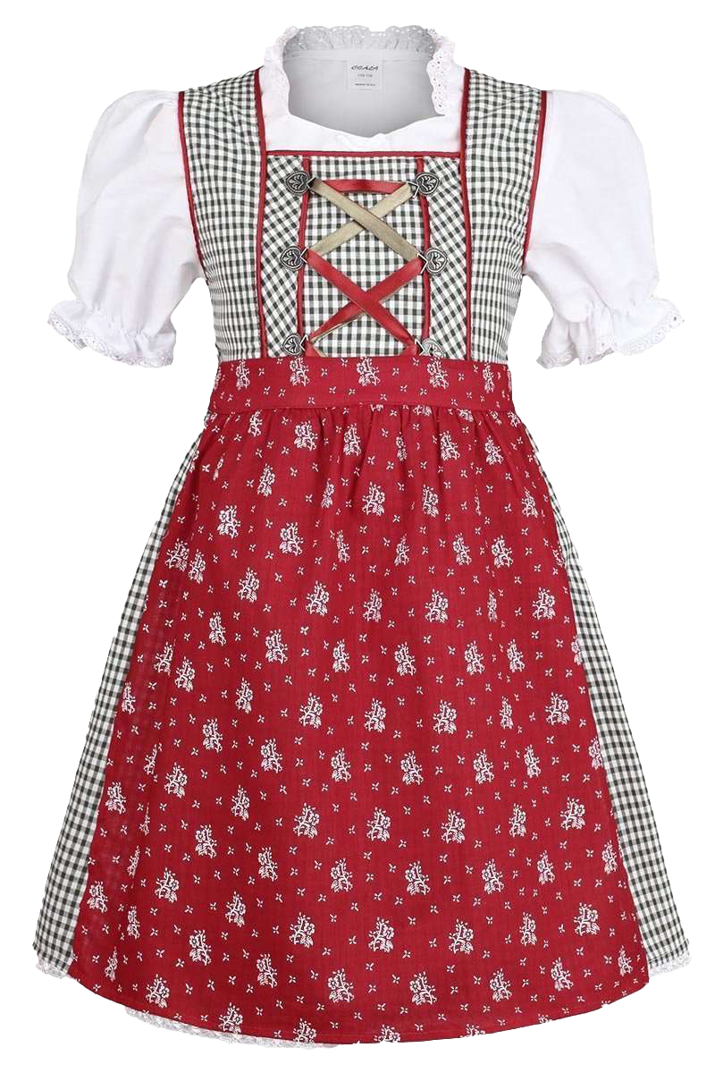 Produktinformationen:Dieses fesche und freche Dirndl der Marke Coala ist für jeden kleinen Trachtenfan die richtige Wahl. Der tolle Kontrast aus Rot und Grün verleiht dem Dirndl seine jugendliche und frische Note. Das Oberteil und der Rock des Dirndls sind mit kleinen Karos in Grün und Weiß geschmückt. Die Ärmelabschlüsse und Zierstreifen am Oberteil sind aus schillerndem, roten Stoff gearbeitet. Die Zierschnürung ist aus roten und grünen Bändern gearbeitet und verläuft in kleinen, metallenen Miederhacken. Das Dirndl wird hinten mit einem Reißverschluss geschlossen.Ausstattung:Zu dem Dirndl gehört eine schlichte, weiße Bluse mit Puffärmelchen und einer Spitzenbordüre am Kragen und an den Ärmelabschlüssen. Die rote Schürze ist über und über mit einem geometrischen Muster aus kleinen weißen Blumen geziert.