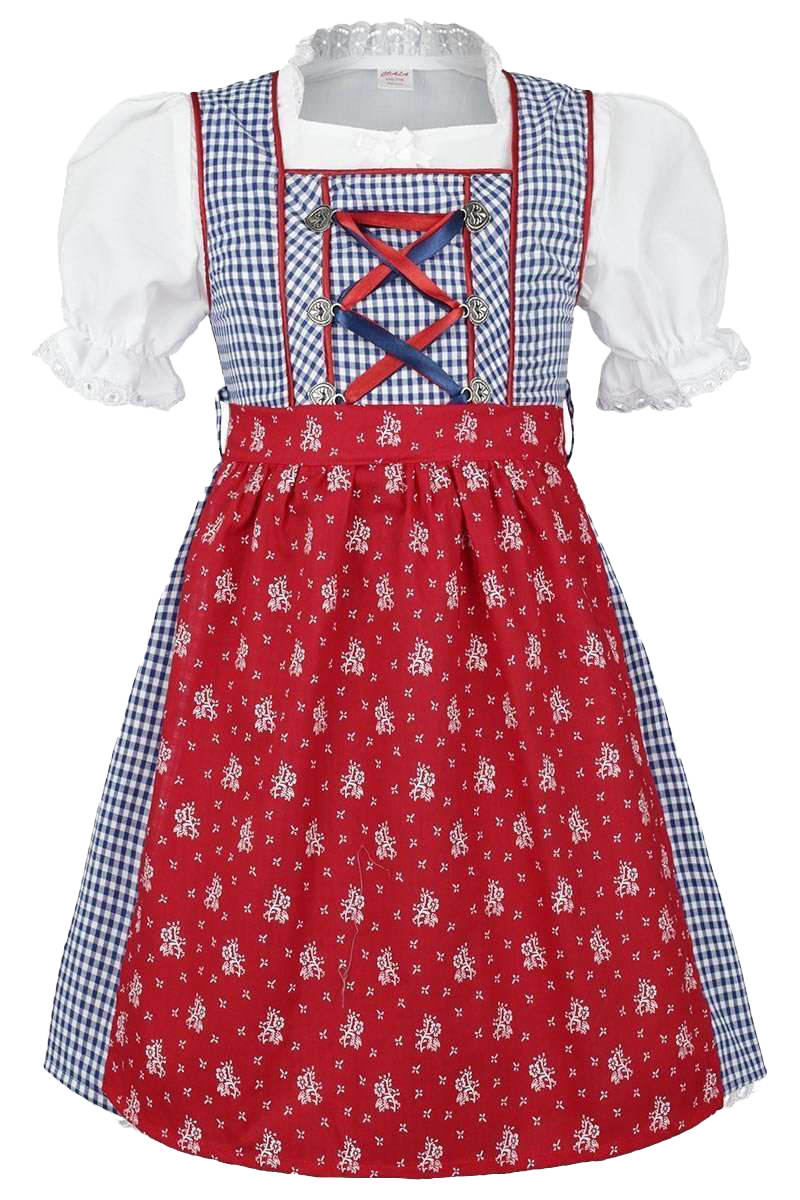 Dieses fesche und freche Dirndl ist für jeden kleinen Trachtenfan die richtige Wahl. Der tolle Kontrast von dem schlichten Blau und dem kräftigen Rot verleiht dem Dirndl seine jugendliche und frische Note. Das Oberteil und der Rock des Dirndls sind mit kleinen Karos in Blau und Weiß geschmückt. Die Ärmelabschlüsse und Zierstreifen am Oberteil sind aus schillerndem, rotem Stoff gearbeitet. Die Zierschnürung ist aus roten und blauen Bändern gearbeitet und verläuft in kleinen, metallenen Miederhacken. Die rote Schürze ist über und über mit einem geometrischen Muster aus kleinen weißen Blumen geziert. Das Dirndl wird hinten mit einem Reißverschluss geschlossen.Zu dem Dirndl gehört eine schlichte, weiße Bluse mit Puffärmelchen und einer Spitzenbordüre am Kragen und an den Ärmelabschlüssen.