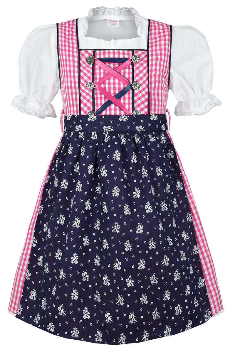 Dieses fesche und freche Dirndl ist für jeden kleinen Trachtenfan die richtige Wahl. Der tolle Kontrast von dem schlichten Blau und dem kräftigen Pink verleiht dem Dirndl seine jugendliche und frische Note. Das Oberteil und der Rock des Dirndls sind mit kleinen Karos in Pink und Weiß geschmückt. Die Ärmelabschlüsse und Zierstreifen am Oberteil sind aus schillerndem, blauem Stoff gearbeitet. Die Zierschnürung ist aus pinken und blauen Bändern gearbeitet und verläuft in kleinen, metallenen Miederhacken. Die blaue Schürze ist über und über mit einem geometrischen Muster aus kleinen weißen Blumen geziert. Das Dirndl wird hinten mit einem Reißverschluss geschlossen.Zu dem Dirndl gehört eine schlichte, weiße Bluse mit Puffärmelchen und einer Spitzenbordüre am Kragen und an den Ärmelabschlüssen.