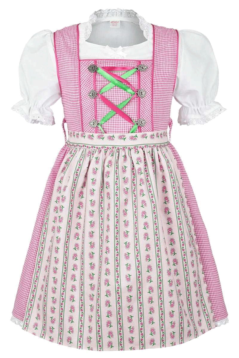 Dieses fesche und freche Dirndl ist für jeden kleinen Trachtenfan die richtige Wahl. Der tolle Kontrast von dem zarten Weiß und dem kräftigen Rosa verleiht dem Dirndl seine jugendliche und frische Note. Das Oberteil und der Rock des Dirndls sind mit kleinen Karos in Rosa und Weiß geschmückt. Die Ärmelabschlüsse und Zierstreifen am Oberteil sind aus schillerndem, pinken Stoff gearbeitet. Die Zierschnürung ist aus pinken und grünen Bändern gearbeitet und verläuft in kleinen, metallenen Miederhacken. Die weiße Schürze ist über und über mit einem geometrischen Muster aus kleinen rosanen Blumen mit grünen Blättern geziert. Das Dirndl wird hinten mit einem Reißverschluss geschlossen.Zu dem Dirndl gehört eine schlichte, weiße Bluse mit Puffärmelchen und einer Spitzenbordüre am Kragen und an den Ärmelabschlüssen.