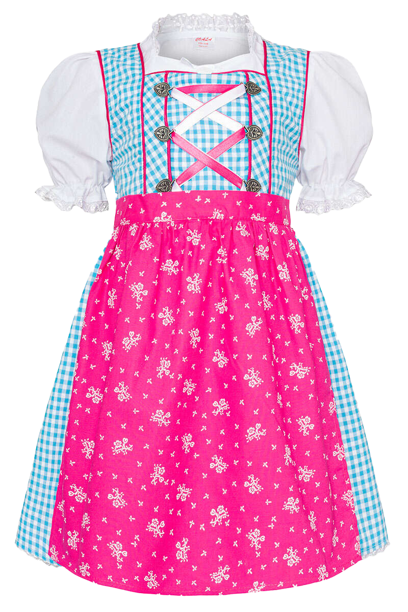 Dieses fesche und freche Dirndl ist für jeden kleinen Trachtenfan die richtige Wahl. Der tolle Kontrast von dem frischem Türkis und dem kräftigen Pink verleiht dem Dirndl seine jugendliche und frische Note. Das Oberteil und der Rock des Dirndls sind mit kleinen Karos in Türkis und Weiß geschmückt. Die Ärmelabschlüsse und Zierstreifen am Oberteil sind aus schillerndem, türkisfarbenem Stoff gearbeitet. Die Zierschnürung ist aus pinken und türkisen Bändern gearbeitet und verläuft in kleinen, metallenen Miederhacken. Die pinke Schürze ist über und über mit einem geometrischen Muster aus kleinen weißen Blumen geziert. Das Dirndl wird hinten mit einem Reißverschluss geschlossen.Zu dem Dirndl gehört eine schlichte, weiße Bluse mit Puffärmelchen und einer Spitzenbordüre am Kragen und an den Ärmelabschlüssen.