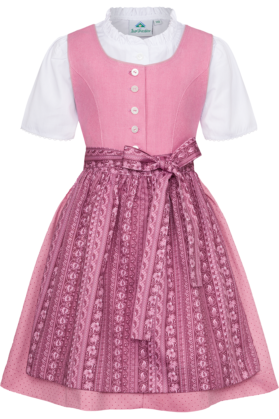 Das Kinderdirndl von Isar-Trachten begeistert mit traditionellem Design und einer hochwertigen Materialkombination aus Leinen und Baumwolle. Das Mieder aus reinem Leinen überzeugt durch seine schlichte Struktur und wird vorne mit Knöpfen in Perlmuttoptik geschlossen. Der gepunktete Rock aus reiner Baumwolle wirkt besonders entzückend und trägt sich dank seiner atmungsaktiven, pflegeleichten Qualität angenehm und komfortabel. Die dunklere Baumwollschürze mit Blumenrankenmuster setzt einen stilvollen Kontrast und rundet das Gesamtbild harmonisch ab.
