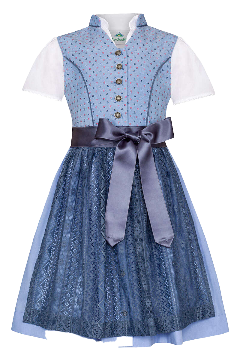 Das hellblaue Dirndl von Isar Trachten ist ein wunderschönes Kinderdirndl mit V-Ausschnitt, Spitzenschürze und vielen liebevollen Details.Das Oberteil ist mit einem hübschen Blumenmuster verziert, das sehr traditionell wirkt. Der Stehkragen und die Wiener Nähte werden durch die dunkelblaue Paspelierung besonders betont. Besonders edel wirkt die Knopfleiste mit Knöpfen in der Farbe Altsilber, mit der das Dirndl geschlossen wird. Der einfarbige Rock bietet durch seine schlichte Gestaltung den passenden Kontrast. Der Rockstoff aus reiner Baumwolle ist sehr angenehm zu tragen, hautfreundlich und atmungsaktiv. Besonders hübsch ist die blaue Spitzenschürze, die mit einem edlen Satinband gebunden ist. Ergänzt wird das Dirndl durch eine kurzärmelige Bluse mit V-Ausschnitt, die an den Ärmelenden mit einer edlen Spitzenborte verziert ist.In Größe 116 ist der Rock ca. 44 cm lang.