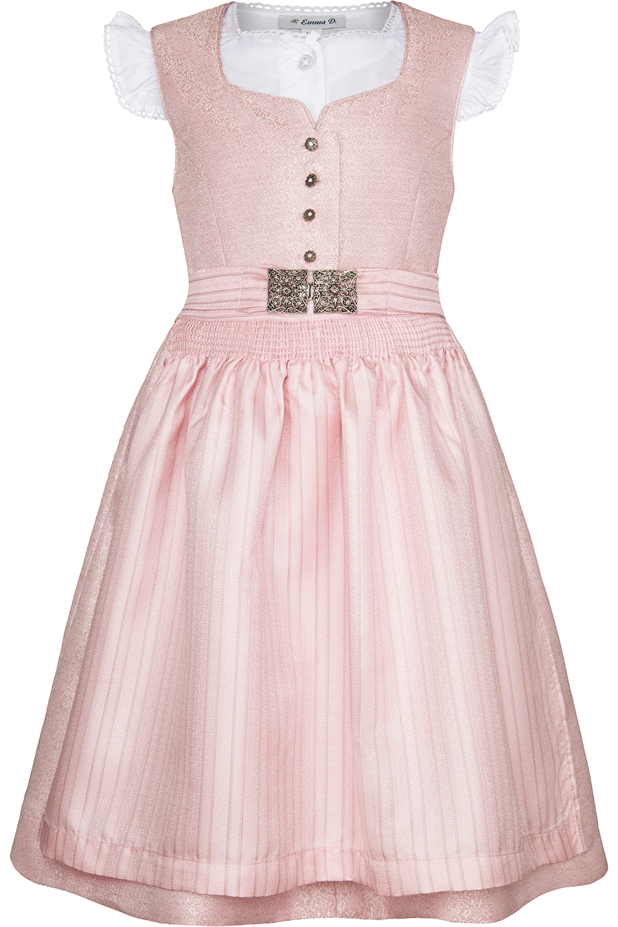 Dieses festliche Kinderdirndl von Emma D. bezaubert mit einem Oberteil und Rock aus glänzendem Jacquard mit zartem Blumenrankmuster. Florale Metallknöpfe mit funkelndem Strassstein setzen edle Akzente, während der eckige Ausschnitt und die Wiener Nähte für eine perfekte Passform sorgen.