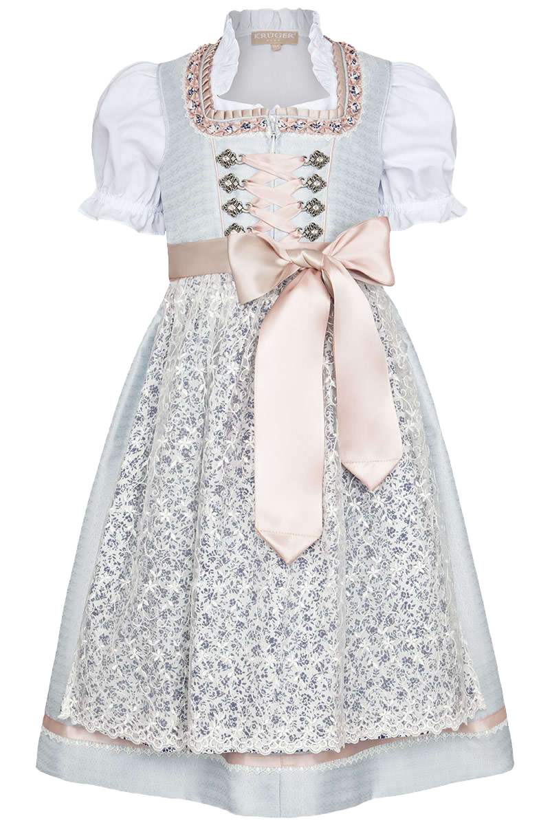 Ein romantisch-festliches Dirndl für junge Mädchen bis ins Teeniealter von Krüger Kids in Hellblau. Das hellblaue Dirndlkleid mit circa 47 cm Rocklänge in der Größe 110 ist aus einem wunderschönen Brokatgewebe mit mittigem Reißverschluss und zahlreichen Applikationen wie Schmuckborten am Ausschnitt, Metallösen mit Glitzersteinen für die Miederschnürung und Ziersaum am Rock gefertigt. Die Schürze ist zweilagig aus einem transparenten Oberstoff in Weiß und dem Unterteil in Weiß mit dunkelblauem Blumenaufdruck kombiniert. Die zum Lieferumfang gehörende weiße Kurzarmbluse ist am Kragen mit einer Rüschenborte besetzt.