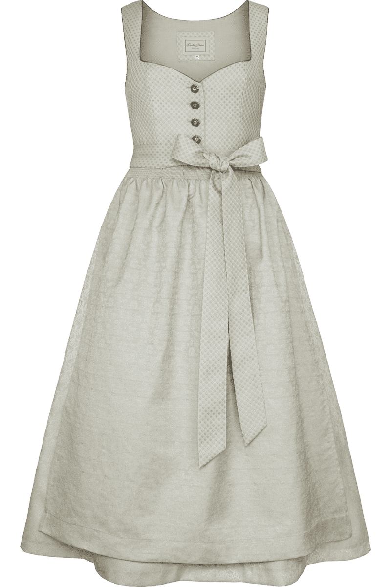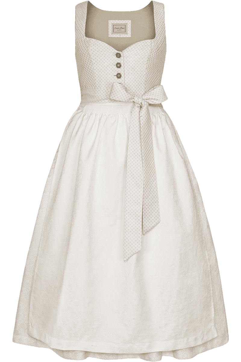 Das Brautdirndl KATHI der Marke Emilia Deiser ist ein bezauberndes, langes Dirndl in Offwhite, das mit seinem herzförmigen Ausschnitt und eleganten Details ein romantisches Design verkörpert. Das Dirndl ist liebevoll mit einem feinen Muster auf dem Oberteil verziert, das dem Dirndl eine subtile Eleganz verleiht. Der herzförmige Ausschnitt und die Armausschnitte sind mit beigefarbener Paspelierung eingefasst. Die Knopfleiste besticht durch wunderschön verzierte Blütenknöpfe in Altsilber. Das Futter aus reiner Baumwolle sorgt besonders an warmen Tagen für angenehmen Tragekomfort. Der Rock ist schlicht in Weiß gehalten, der Oberstoff mit einem hübschen Blumenmuster verziert. Die unifarbene weiße Schürze mit dezentem Blumenmuster rundet das Gesamtbild ab und sorgt für einen harmonischen Look. Das Brautdirndl ist perfekt für die moderne Braut, die traditionellen Stil mit einem Hauch Individualität sucht und an ihrem besonderen Tag strahlen möchte.