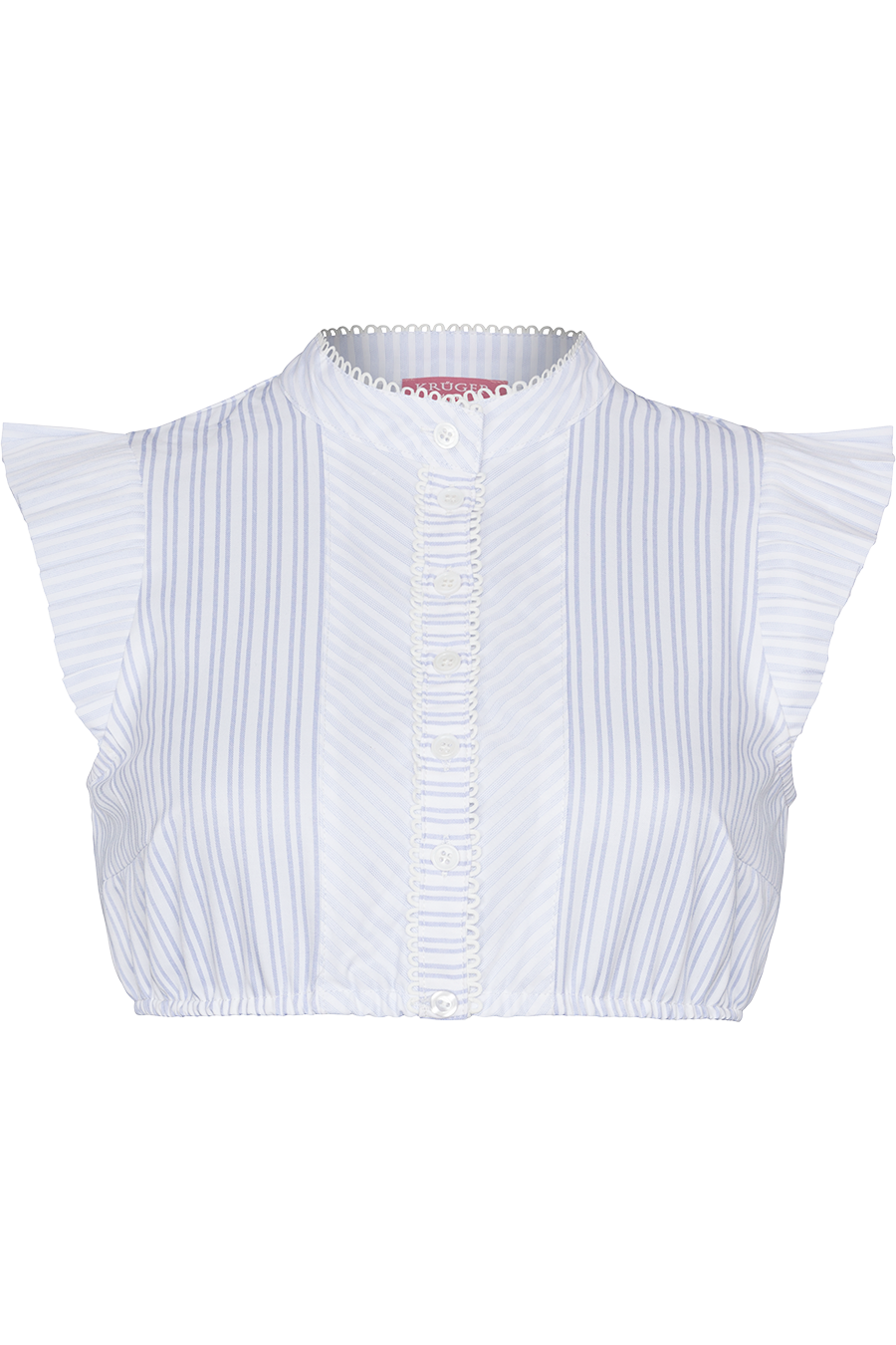 Die blickdichte Dirndlbluse von Krüger Madl begeistert mit einem außergewöhnlichen Design und femininer Ausstrahlung. Das zarte Streifenmuster verleiht ihr eine moderne, doch traditionelle Note. Wunderschön in Falten gelegte Flügelärmel setzen verspielte Akzente und unterstreichen den romantischen Charakter der Bluse. Der schmale Stehkragen sowie die hochgeschlossene Knopfleiste mit dekorativer Bordüre runden das edle Gesamtbild harmonisch ab.