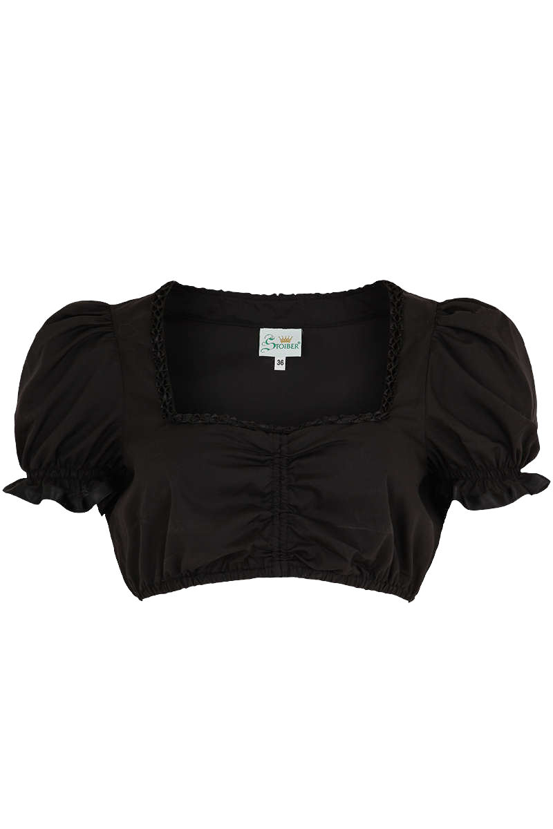 Eine schwarze Rüsche verziert den tiefen Balkonausschnitt der Bluse und verleiht dem Dekolleté einen besonderen Auftritt. Die kurzen Puffärmel sind mit Gummizug abgeschlossen, ebenso wie der Saumabschluss, so dass ein perfekter Sitz garantiert ist. Die Tiefe des Ausschnitts lässt sich durch eine verstellbare Schnürung dem Ausschnitt des Dirndls anpassen.