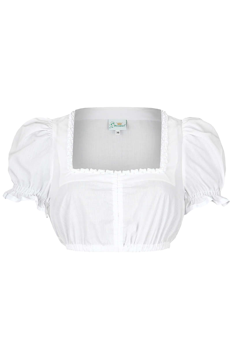 Eine weiße Rüsche verziert den tiefen Balkonausschnitt der Bluse und verleiht dem Dekolleté einen besonderen Auftritt. Die kurzen Puffärmel sind mit Gummizug abgeschlossen, ebenso wie der Saumabschluss, so dass ein perfekter Sitz garantiert ist. Die Tiefe des Ausschnitts lässt sich durch eine verstellbare Schnürung dem Ausschnitt des Dirndls anpassen.