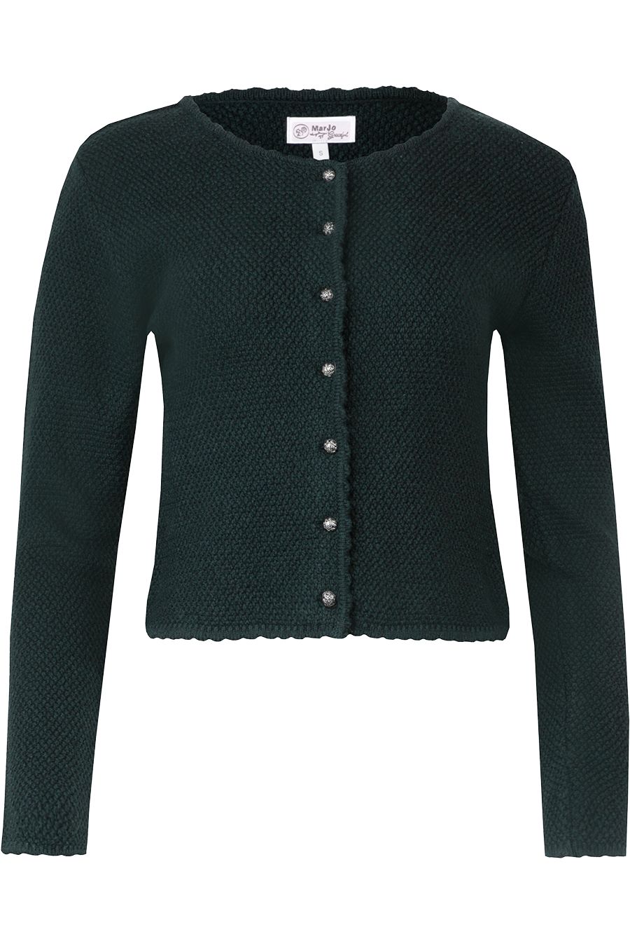 Die Damen Dirndljacke VILSECK von MarJo besticht durch ihr wunderschönes Strickmuster und die wellenförmige Saumverarbeitung. Mit klassischem Rundhalsausschnitt und langen Ärmeln ist sie der perfekte Begleiter für kühle Trachtentage. Die durchgehende Knopfleiste mit halbrunden, liebevoll verzierten Knöpfen unterstreicht den traditionellen Charme. Der taillierte, kurze Schnitt zaubert eine feminine Silhouette und macht die Jacke zu einem stilvollen Highlight für Ihr Trachtenoutfit. Ideal für moderne Damen, die Tradition und Eleganz verbinden möchten.