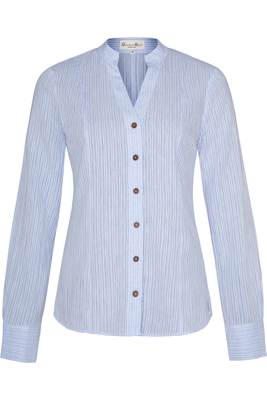 Diese Bluse besticht durch ihren edlen Baumwoll-Leinen-Mix, der für ein angenehmes Tragegefühl sorgt. Das dezente, eingewebte Streifenmuster verleiht der Bluse eine klassische Note. Der stilvolle Stehkragen mit kleinem V-Ausschnitt geht elegant in eine Knopfleiste mit dunklen Holzknöpfen über. Lange Ärmel mit Knopfmanschetten und der taillierte Schnitt unterstreichen die feminine Silhouette. Der leicht abgerundete Saum sorgt für einen harmonischen Abschluss. Perfekt für Trachten-Looks mit modernem Flair!