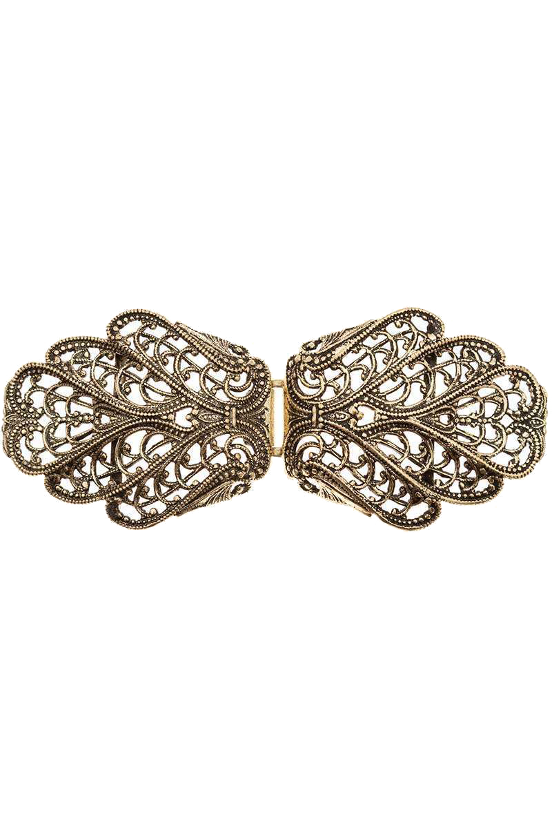 Eine fein ziselierte Metallschließe für Schürzenbänder in Altgold. Die vielen Durchbrüche verleihen der Schließe ein filigranes Aussehen. Zur einfachen Anbringung der Bänder an die Schließe ist auf der Innenseite jeweils ein Bügel angebracht. Im geschlossenen Zustand ist die Schließe 10 cm breit und 4 cm hoch