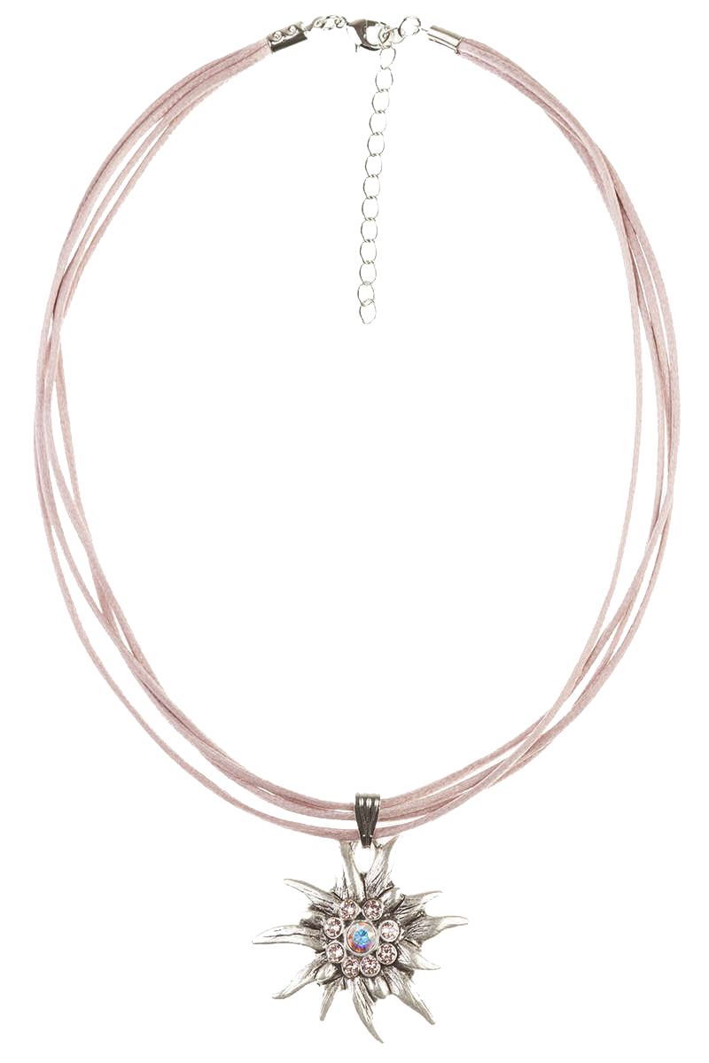 Das Halsband mit 42 cm Länge besteht aus zwei einzelnen Textilbändern in feinem Altrosa, das mit einem Karabiner verschlossen wird. Der Anhänger aus silberfarbenem Metall stellt ein ca. 4,0 cm großes, schön gearbeitetes Edelweiß dar, auf dem Glitzersteine in Weiß und Rosa funkeln. Die Bandlänge kann durch ein Kettchen um 6 cm verlängert werden.