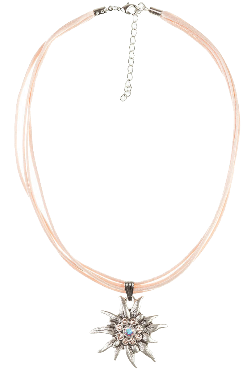Das Halsband mit 42 cm Länge besteht aus zwei einzelnen Textilbändern in feinem Apricot, das mit einem Karabiner verschlossen wird. Der Anhänger aus silberfarbenem Metall stellt ein ca. 4,0 cm großes, schön gearbeitetes Edelweiß dar, auf dem Glitzersteine in Weiß und Rosa funkeln. Die Bandlänge kann durch ein Kettchen um 6 cm verlängert werden.