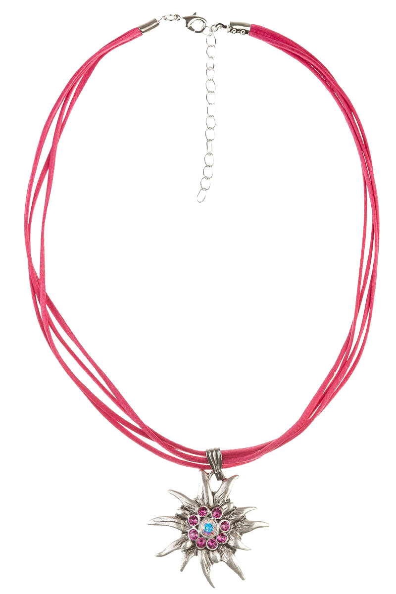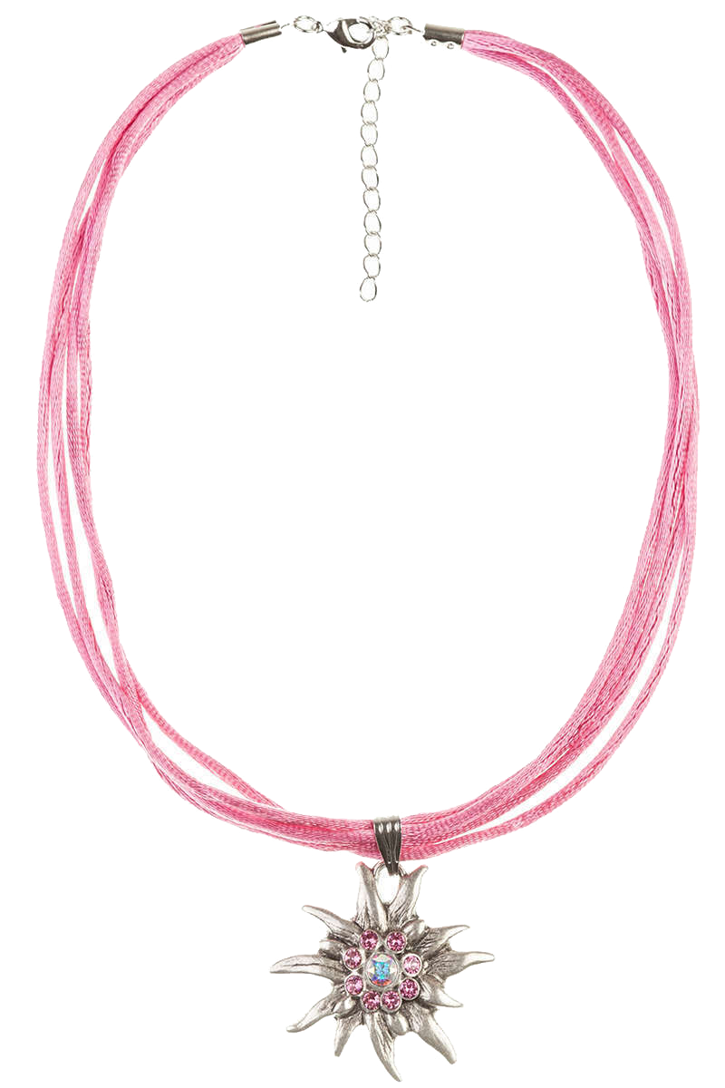 Das Halsband mit 42 cm Länge besteht aus zwei einzelnen Textilbändern in kräftigem Pink, das mit einem Karabiner verschlossen wird. Der Anhänger aus silberfarbenem Metall stellt ein ca. 4,0 cm großes, schön gearbeitetes Edelweiß dar, auf dem Glitzersteine in Weiß und Rosa funkeln. Die Bandlänge kann durch ein Kettchen um 6 cm verlängert werden.