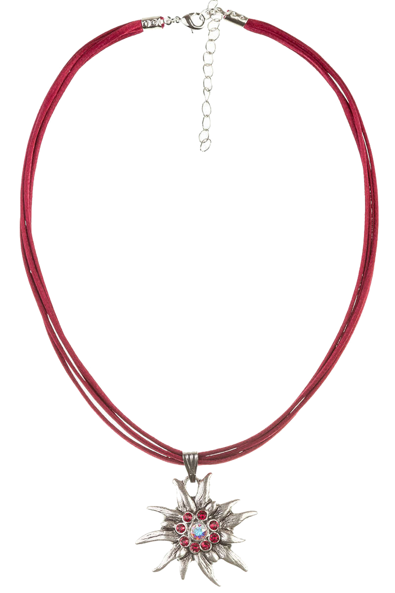 Das Halsband mit 42 cm Länge besteht aus zwei einzelnen Textilbändern in kräftigem Bordeaux, das mit einem Karabiner verschlossen wird. Der Anhänger aus silberfarbenem Metall stellt ein ca. 4,0 cm großes, schön gearbeitetes Edelweiß dar, auf dem Glitzersteine in Weiß und Rot funkeln. Die Bandlänge kann durch ein Kettchen um 6 cm verlängert werden.