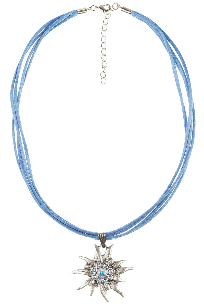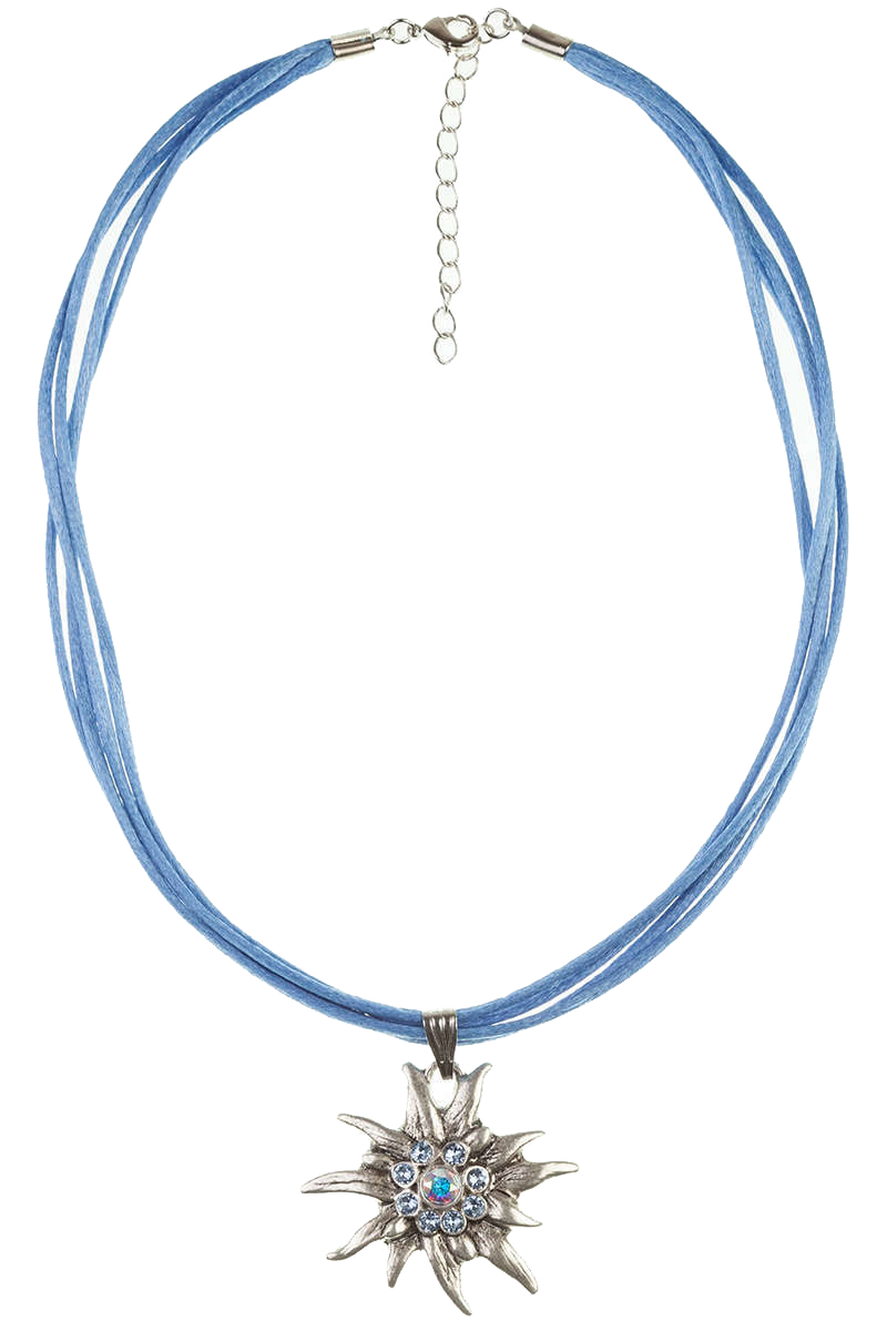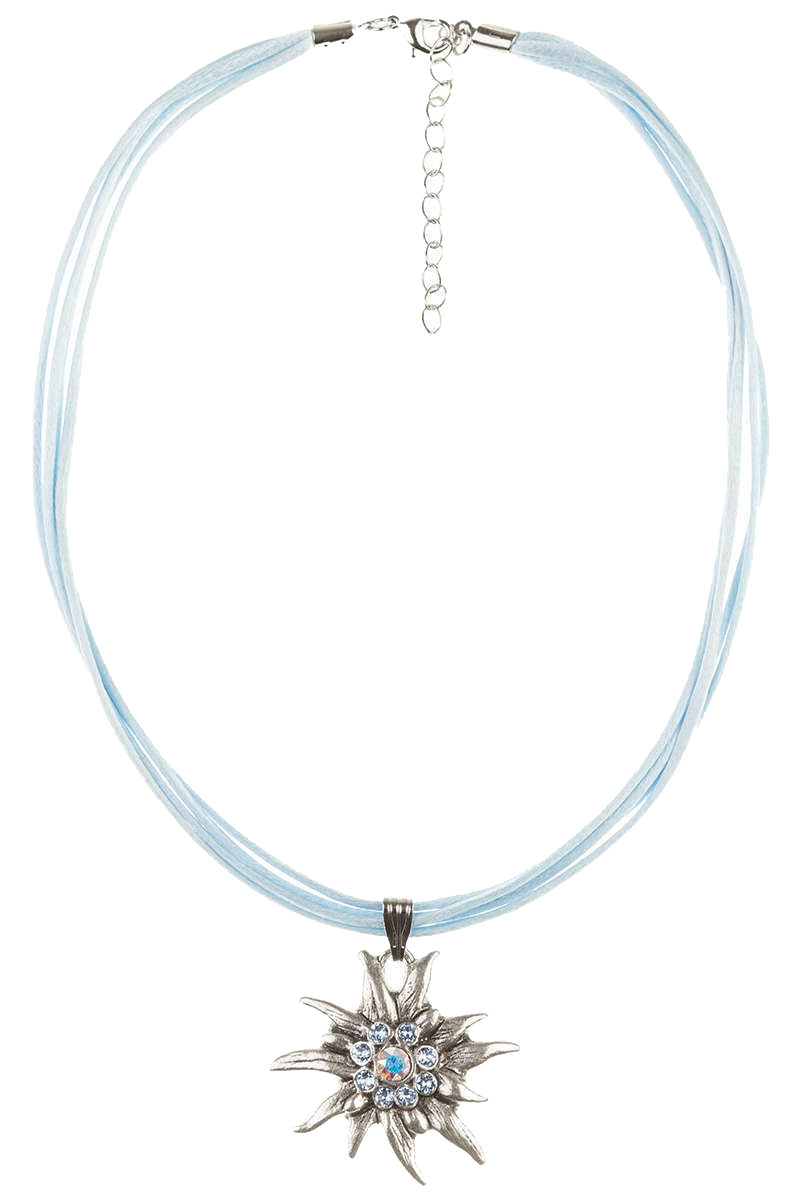 Das Halsband mit 42 cm Länge besteht aus zwei einzelnen Textilbändern in feinem Hellblau, das mit einem Karabiner verschlossen wird. Der Anhänger aus silberfarbenem Metall stellt ein ca. 4,0 cm großes, schön gearbeitetes Edelweiß dar, auf dem Glitzersteine in Weiß und Blau funkeln. Die Bandlänge kann durch ein Kettchen um 6 cm verlängert werden.