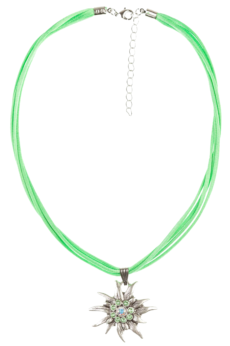 Das Halsband mit 42 cm Länge besteht aus zwei einzelnen Textilbändern in feinem Apfelgrün, das mit einem Karabiner verschlossen wird. Der Anhänger aus silberfarbenem Metall stellt ein ca. 4,0 cm großes, schön gearbeitetes Edelweiß dar, auf dem Glitzersteine in Grün und Hellgrün funkeln. Die Bandlänge kann durch ein Kettchen um 6 cm verlängert werden.