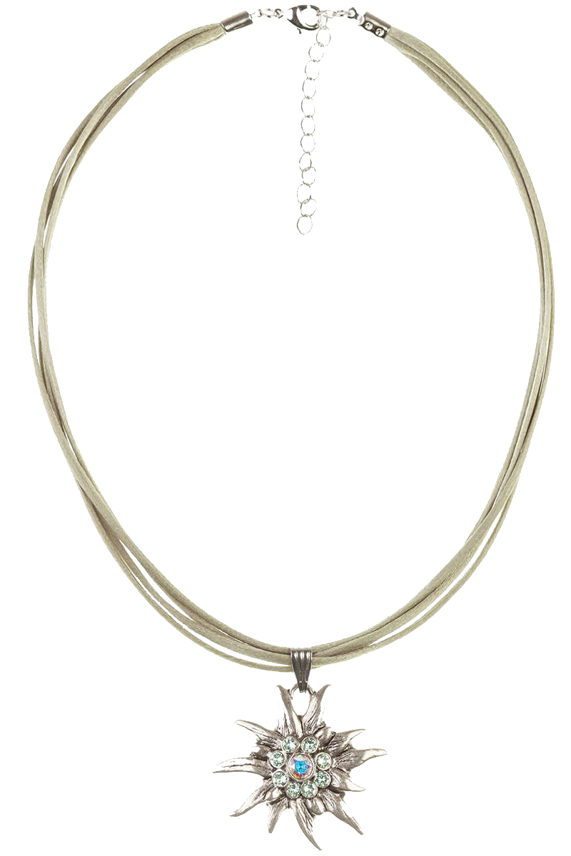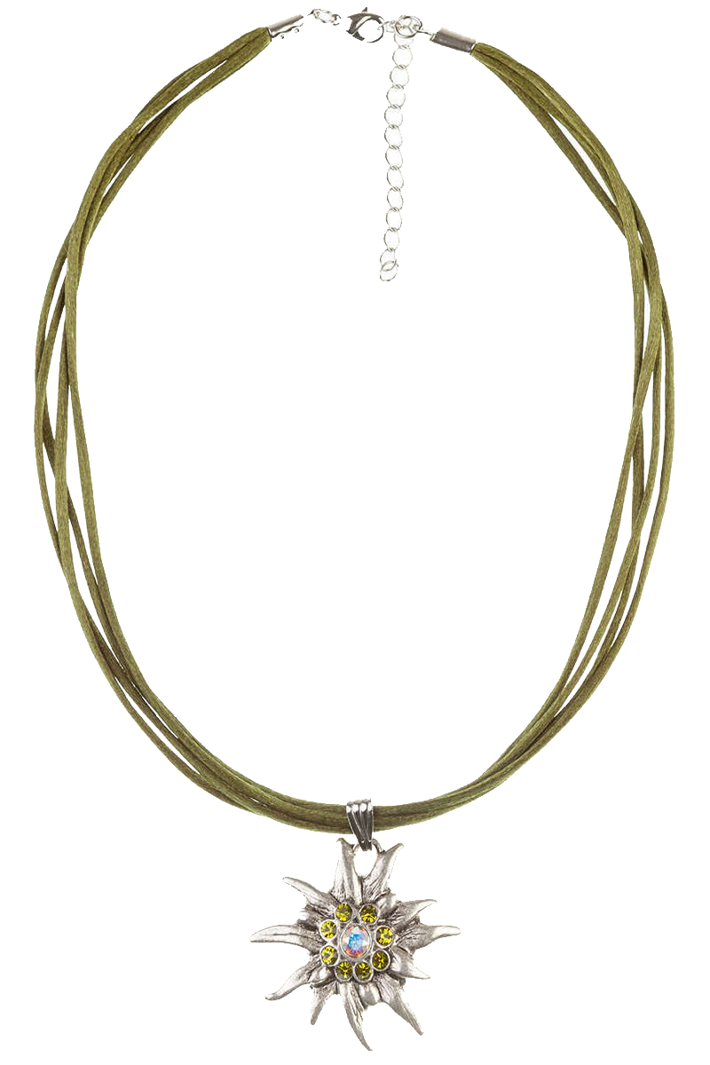 Das Halsband mit 42 cm Länge besteht aus zwei einzelnen Textilbändern in feinem Oliv, das mit einem Karabiner verschlossen wird. Der Anhänger aus silberfarbenem Metall stellt ein ca. 4,0 cm großes, schön gearbeitetes Edelweiß dar, auf dem Glitzersteine in Grün und Weiß funkeln. Die Bandlänge kann durch ein Kettchen um 6 cm verlängert werden.