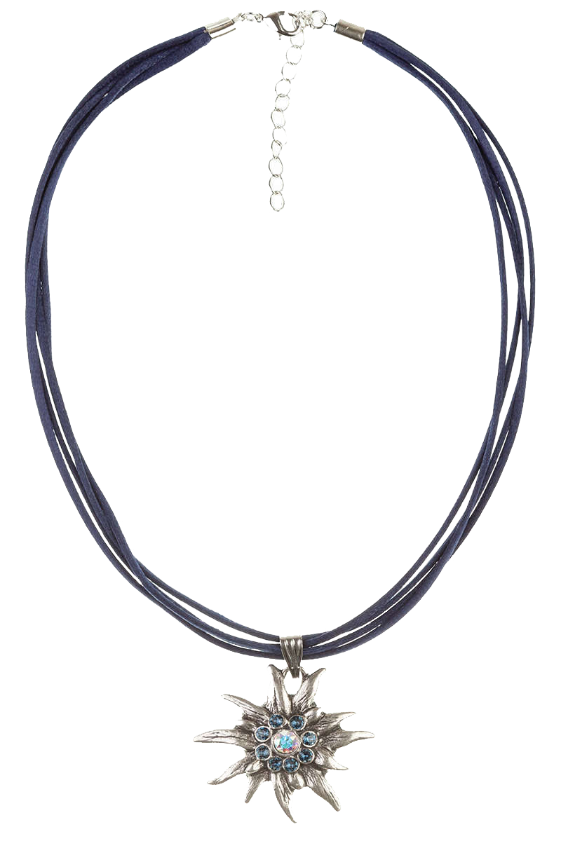 Das Halsband mit 42 cm Länge besteht aus zwei einzelnen Textilbändern in kräftigen Dunkelblau, das mit einem Karabiner verschlossen wird. Der Anhänger aus silberfarbenem Metall stellt ein ca. 4,0 cm großes, schön gearbeitetes Edelweiß dar, auf dem Glitzersteine in Weiß und Blau funkeln. Die Bandlänge kann durch ein Kettchen um 6 cm verlängert werden.