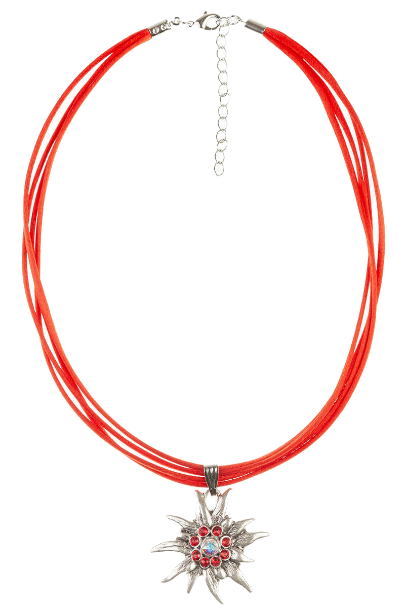 Das Halsband mit 42 cm Länge besteht aus zwei einzelnen Textilbändern in kräftigem Rot, das mit einem Karabiner verschlossen wird. Der Anhänger aus silberfarbenem Metall stellt ein ca. 4,0 cm großes, schön gearbeitetes Edelweiß dar, auf dem Glitzersteine in Weiß und Rot funkeln. Die Bandlänge kann durch ein Kettchen um 6 cm verlängert werden.