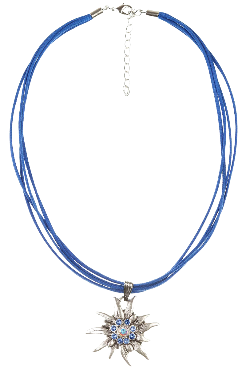 Das Halsband mit 42 cm Länge besteht aus zwei einzelnen Textilbändern in feinem Royalblau, das mit einem Karabiner verschlossen wird. Der Anhänger aus silberfarbenem Metall stellt ein ca. 4,0 cm großes, schön gearbeitetes Edelweiß dar, auf dem Glitzersteine in Weiß und Blau funkeln. Die Bandlänge kann durch ein Kettchen um 6 cm verlängert werden.