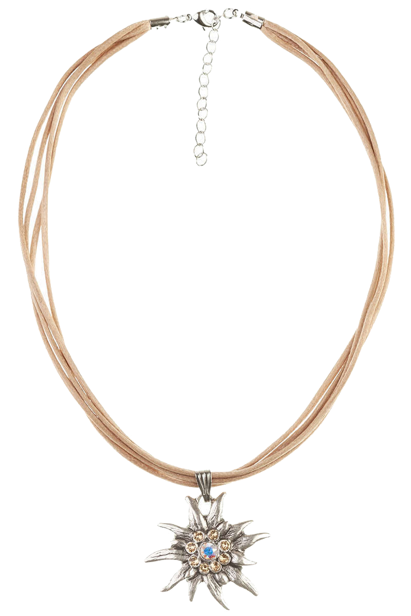 Das Halsband mit 42 cm Länge besteht aus zwei einzelnen Textilbändern in feinem Rehbraun, das mit einem Karabiner verschlossen wird. Der Anhänger aus silberfarbenem Metall stellt ein ca. 4,0 cm großes, schön gearbeitetes Edelweiß dar, auf dem Glitzersteine in Weiß und Gelb funkeln. Die Bandlänge kann durch ein Kettchen um 6 cm verlängert werden.