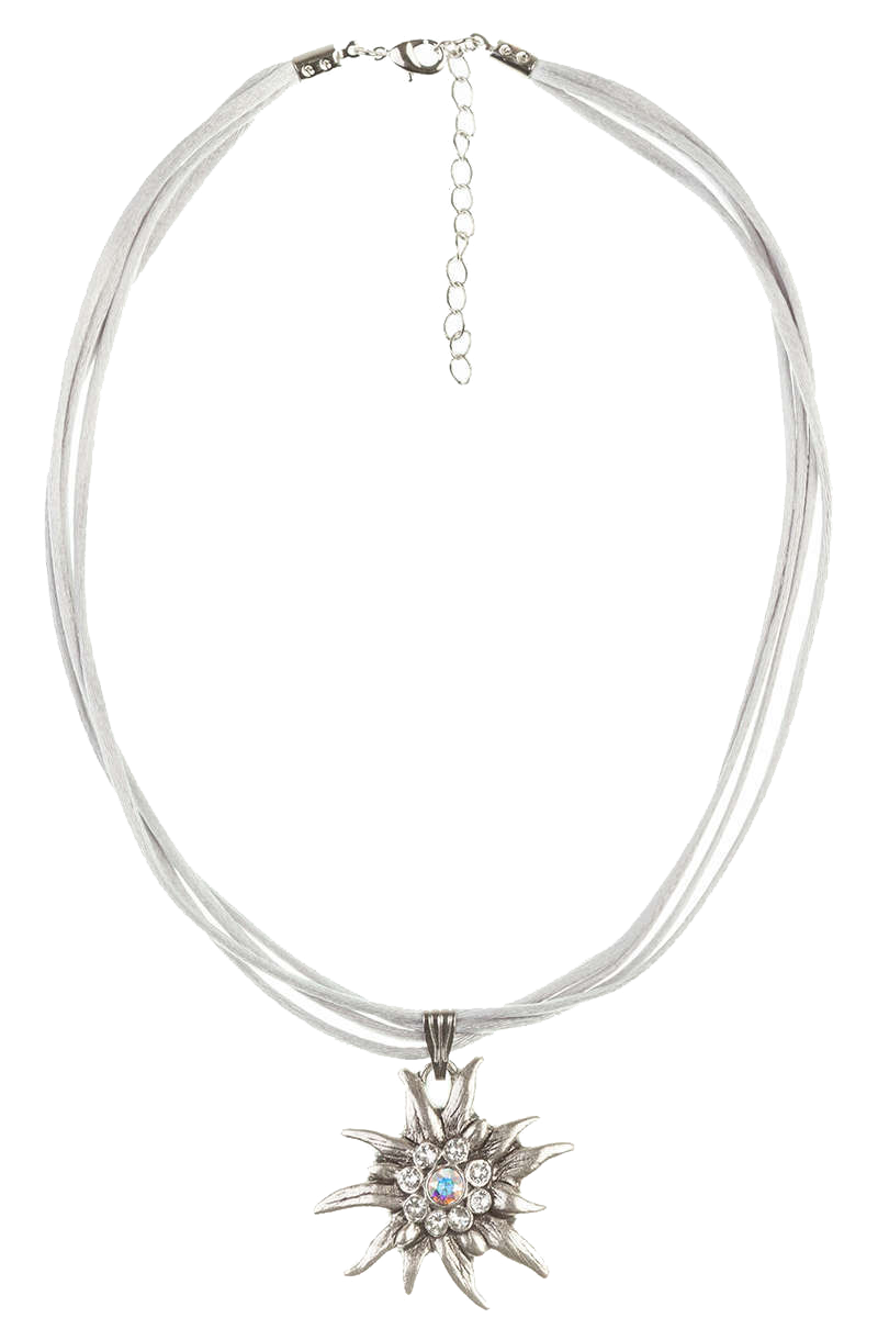 Das Halsband mit 42 cm Länge besteht aus zwei einzelnen Textilbändern in glänzendem Hellgrau, das mit einem Karabiner verschlossen wird. Der Anhänger aus silberfarbenem Metall stellt ein ca. 4,0 cm großes, schön gearbeitetes Edelweiß dar, auf dem Glitzersteine in Weiß funkeln. Die Bandlänge kann durch ein Kettchen um 6 cm verlängert werden.