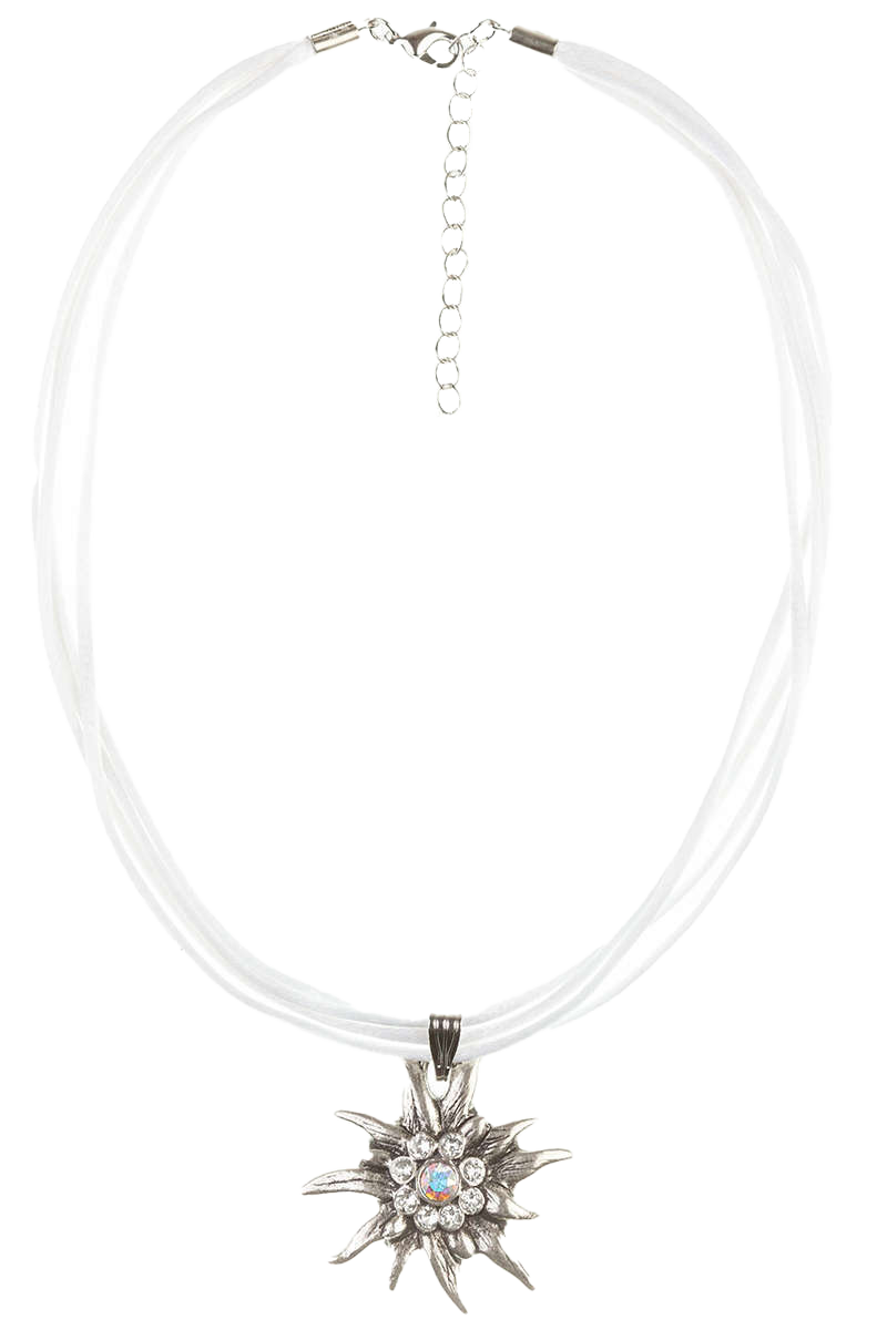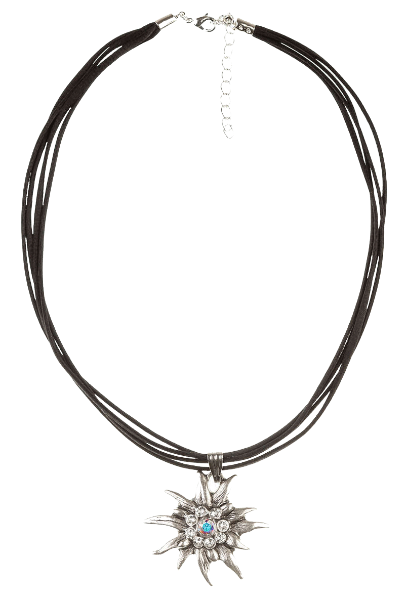 Das Halsband mit 42 cm Länge besteht aus vier einzelnen Textilbändern in Schwarz, das mit einem Karabiner verschlossen wird. Der Anhänger aus silberfarbenem Metall stellt ein ca. 4 cm großes, schön gearbeitetes Edelweiß dar, auf dem Glitzersteine in Weiß funkeln. Die Bandlänge kann durch ein Kettchen um 6 cm verlängert werden.