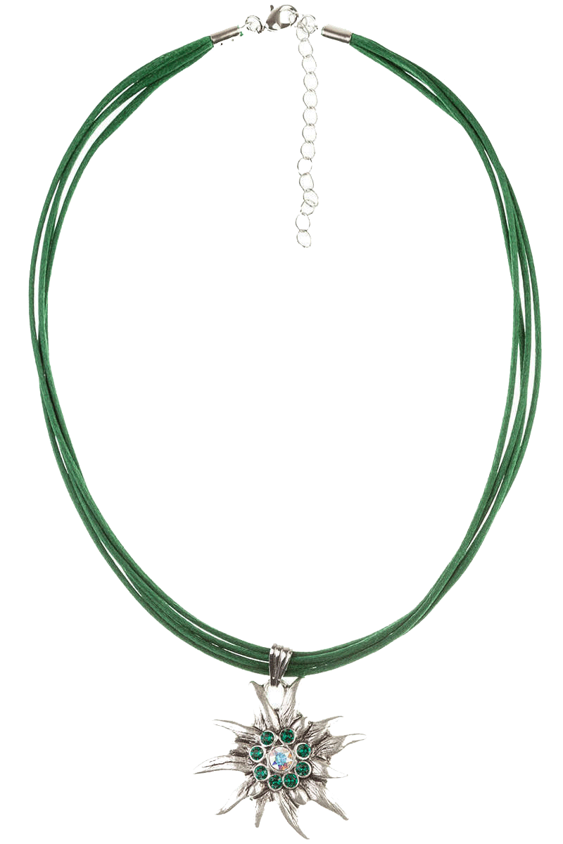 Das Halsband mit 42 cm Länge besteht aus vier einzelnen Textilbändern in kräftigem Grün das mit einem Karabiner verschlossen wird. Der Anhänger aus silberfarbenem Metall stellt ein ca. 4,0 cm großes, schön gearbeitetes Edelweiß dar, auf dem Glitzersteine in Weiß und Grün funkeln. Die Bandlänge kann durch ein Kettchen um 6 cm verlängert werden.