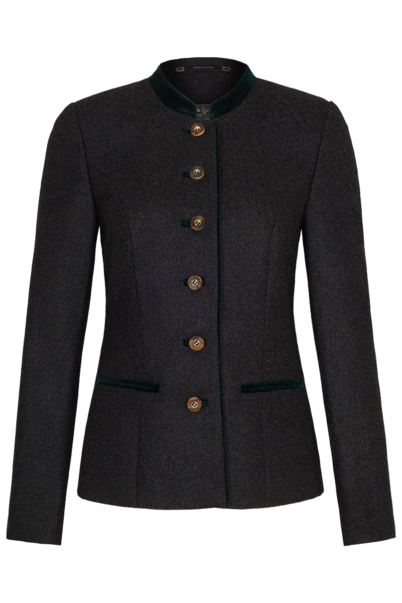 DORNBIRN von Hammerschmid ist ein schicker Damenblazer aus anthrazitfarbenem Loden. Die Taschen und die Knopfleiste sind ebenso wie der Stehkragen mit grünem Samt besetzt. Die Knöpfe sind aus echtem Horn und sorgen für einen traditionellen Look. Das rundum eingearbeitete silbergraue Futter zeugt von der hochwertigen Verarbeitung. Die Jacke ist körpernah geschnitten.In der Größe 36 beträgt die Rückenlänge 60 cm.