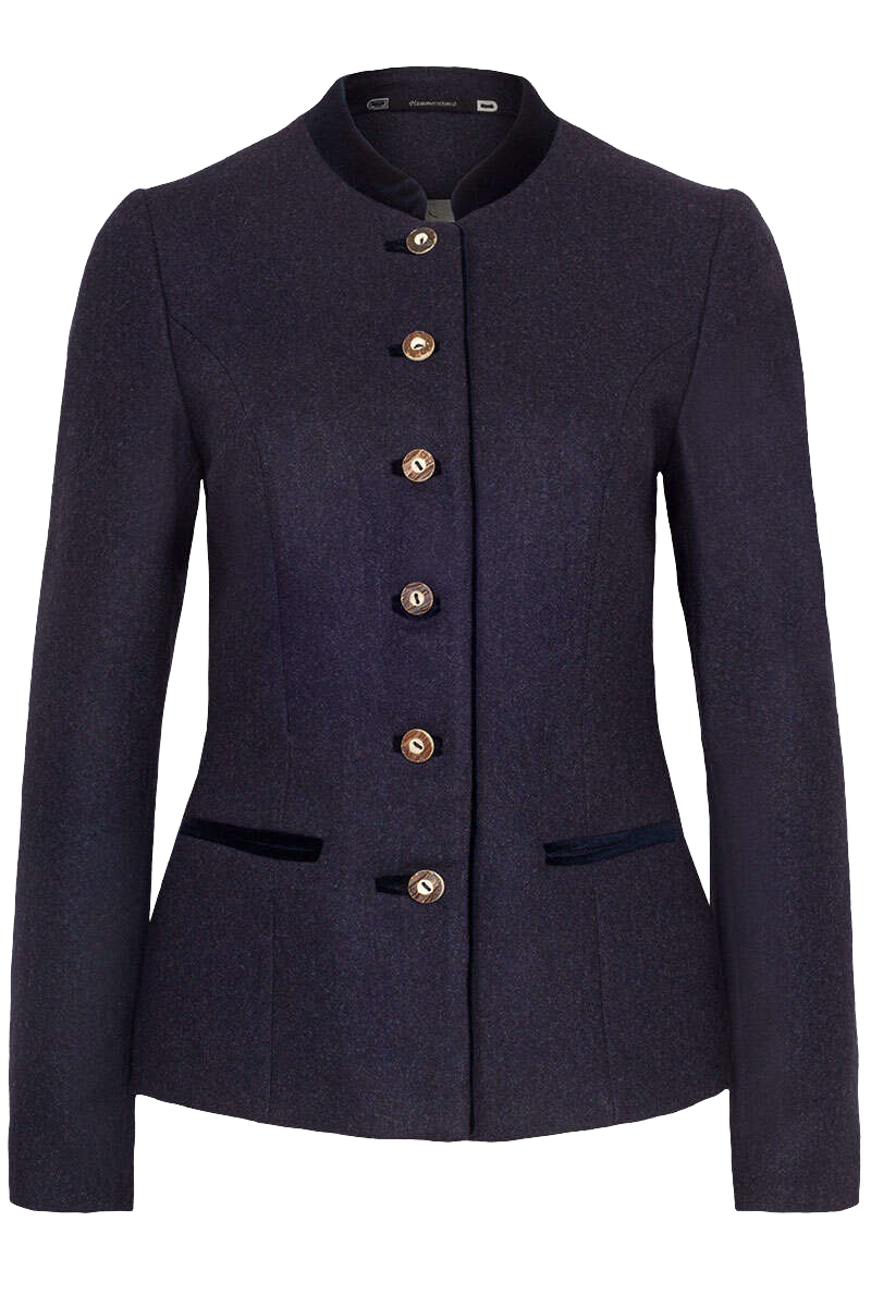 DORNBIRN von Hammerschmid ist ein schicker Damenblazer aus marineblauem Loden. Die Taschen und die Knopfleiste sind mit blauem Samt besetzt, ebenso der Stehkragen. Die Knöpfe sind aus echtem Horn gefertigt. Das rundum eingearbeitete silbergraue Futter ist ein Beleg für die hochwertige Ausstattung. Der Schnitt der Jacke ist körpernah.