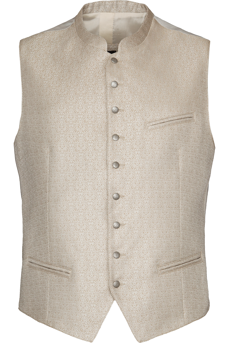 Die edel schimmernde Vorderseite ist mit einem feinen Jacquard-Ornamentmuster verziert und strahlt durch ihre hochwertige Verarbeitung pure Klasse aus. Der schmale Stehkragen und die reich verzierten Knöpfe unterstreichen den festlichen Look. Dank des taillierten Slim Fit-Schnitts sitzt die Weste modern und körpernah.