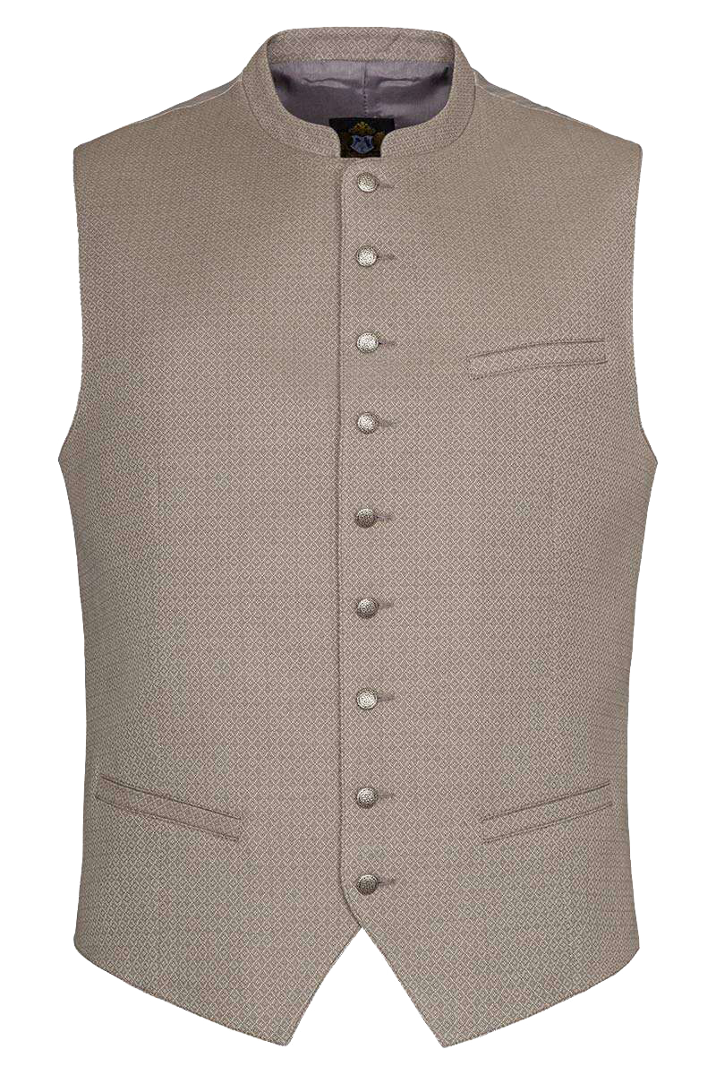 Die edle beige Trachtenweste OTTO von Hammerschmid wirkt mit ihrem feinen, gleichmäßigen Muster auf der Vorderseite und den eleganten Nadelstreifen auf der Rückseite sehr festlich. Die Weste ist wegen ihrer beigen Farbe auch für Hochzeiten in Tracht geeignet.Die Knopfleiste ist mit aufwendig gearbeiteten, altsilberfarbenen Spezialknöpfen verziert. Die Weste ist klassisch mit Stehkragen, zwei Vordertaschen und einer Brusttasche ausgestattet. Sie ist innen vollständig gefüttert.Die Weite kann im Rücken durch einen so genannten Dragoner reguliert werden. Der Slim-Fit-Schnitt sorgt für eine körperbetonte Silhouette.Die Rückenlänge in Größe 50 beträgt ca. 60 cm.