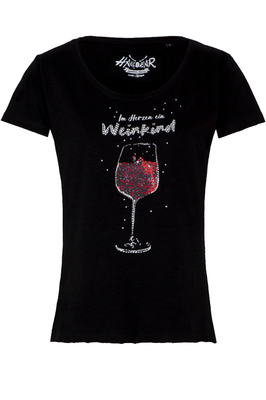 Der taillierte Schnitt, kurze Ärmel und der klassische Rundhalsausschnitt sorgen für eine feminine und bequeme Passform. Auf der Vorderseite begeistert ein edler Druck mit Weinglas und dem Schriftzug „Im Herzen ein Weinkind“, verziert mit funkelnden Strasssteinen. Ein liebevolles Detail auf der Rückseite: der kleine Aufdruck „Weinverliebt“ direkt unterhalb des Kragens.